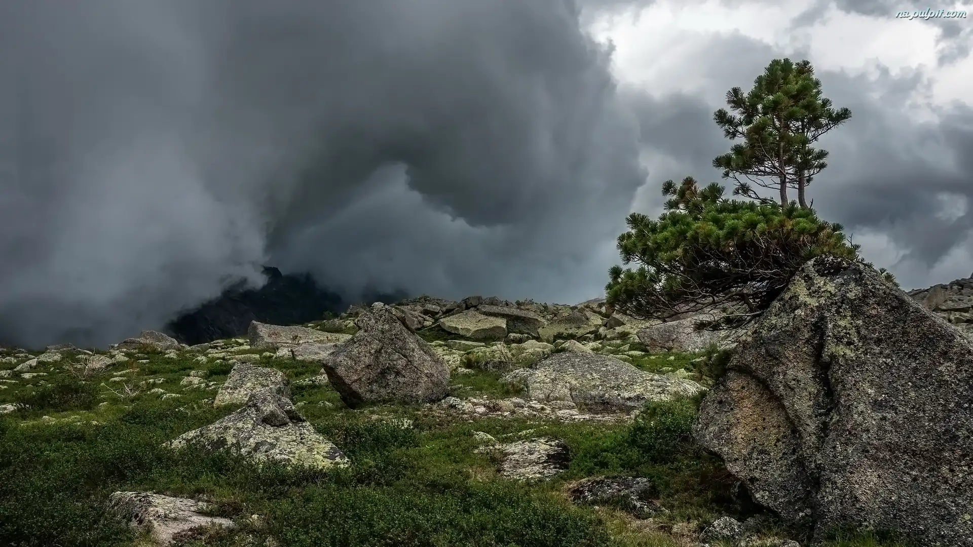 Kamienie, Chmury, Trawa, Drzewa, Skały, Ciemne Na Pulpit