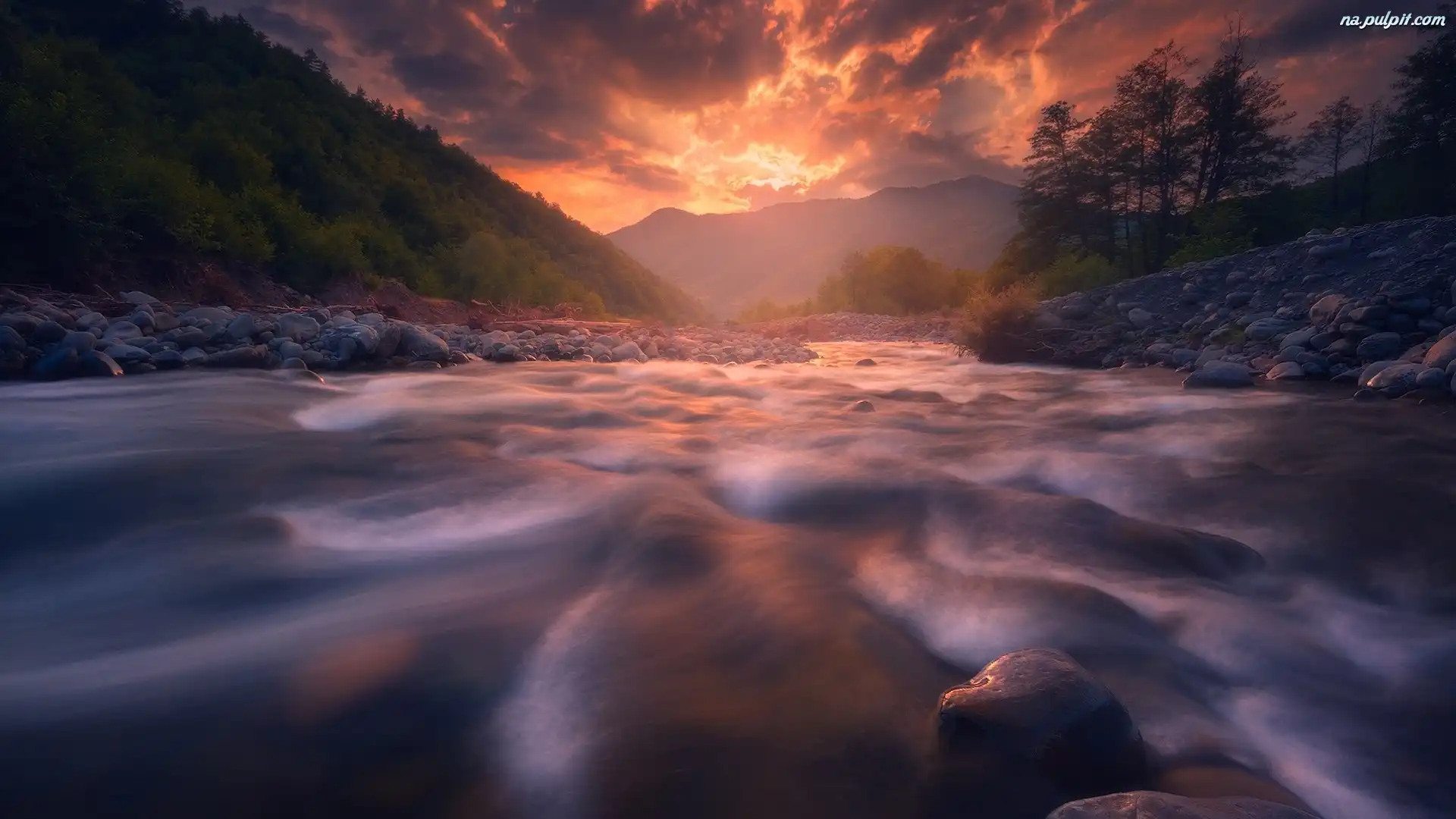 Kamienie, Góry, Rzeka, Zachód słońca, Drzewa Na Pulpit