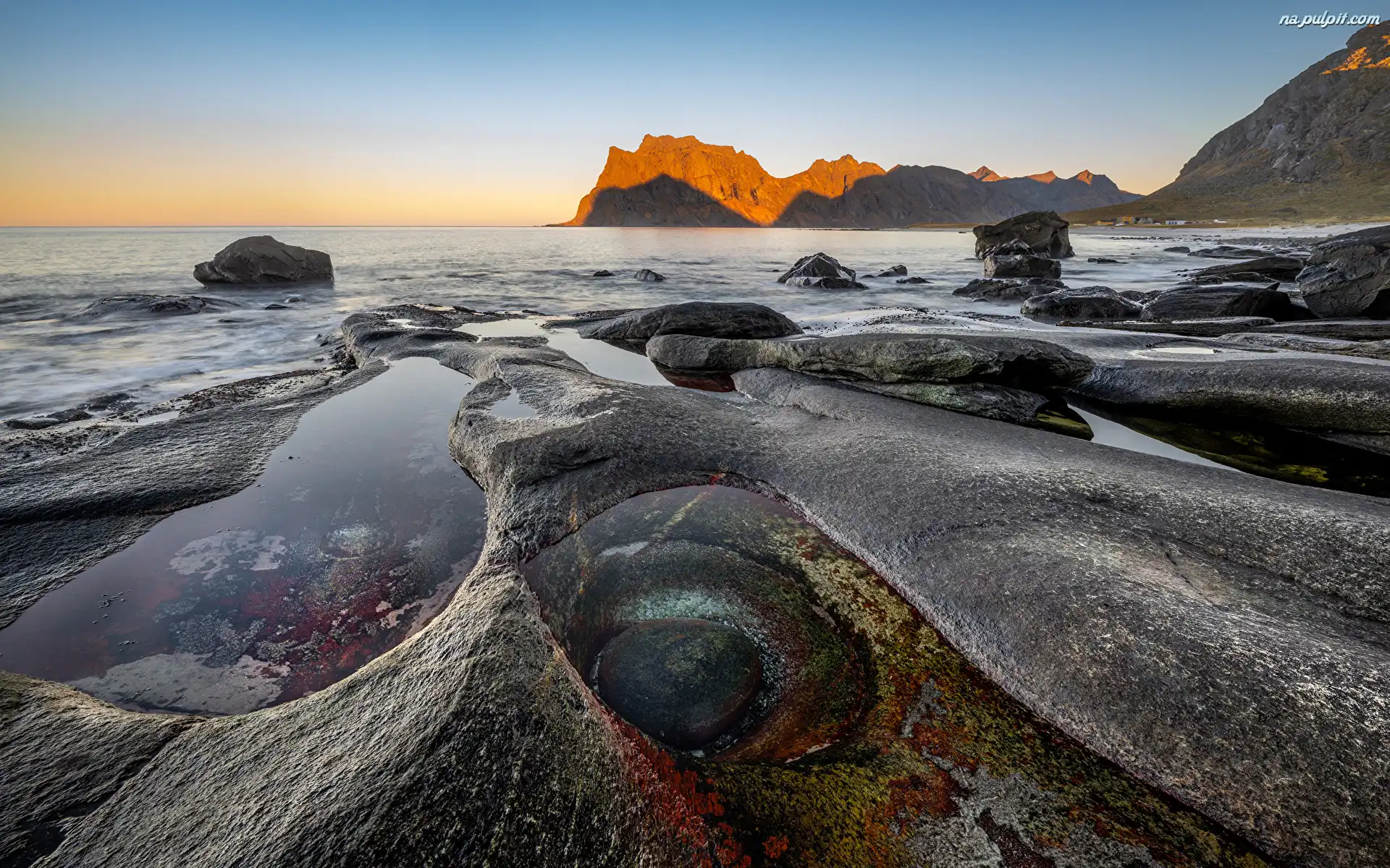 Skały, Norwegia, Chmury, Kamienie, Zachód słońca, Lofoty, Góry, Głazy, Uttakleiv Beach, Morze, Niebo Na Pulpit |