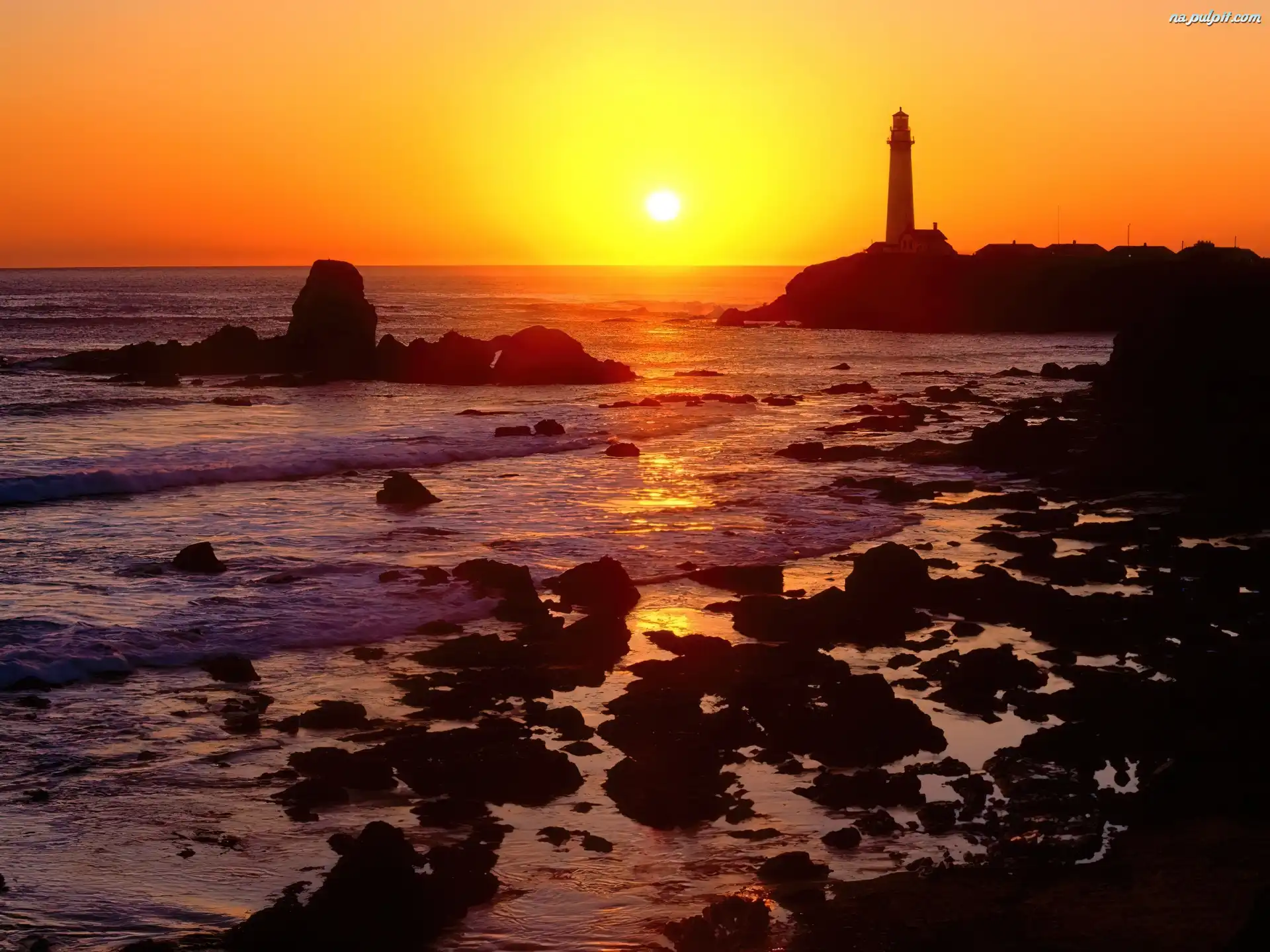 Kamienie, Fale, Latarnia morska, Zachód Słońca Na Pulpit
