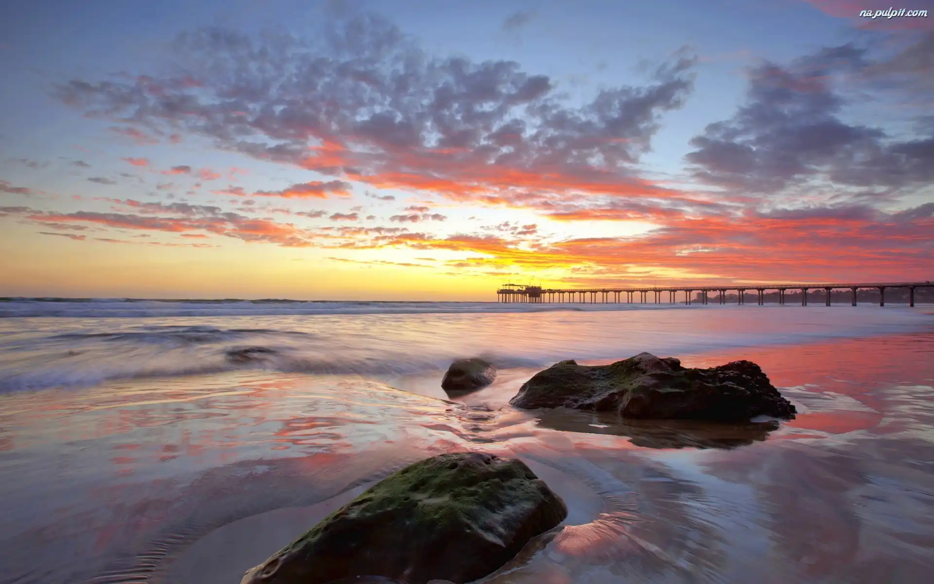 Kamienie, Chmury, Molo, Morze, Zachód słońca Na Pulpit