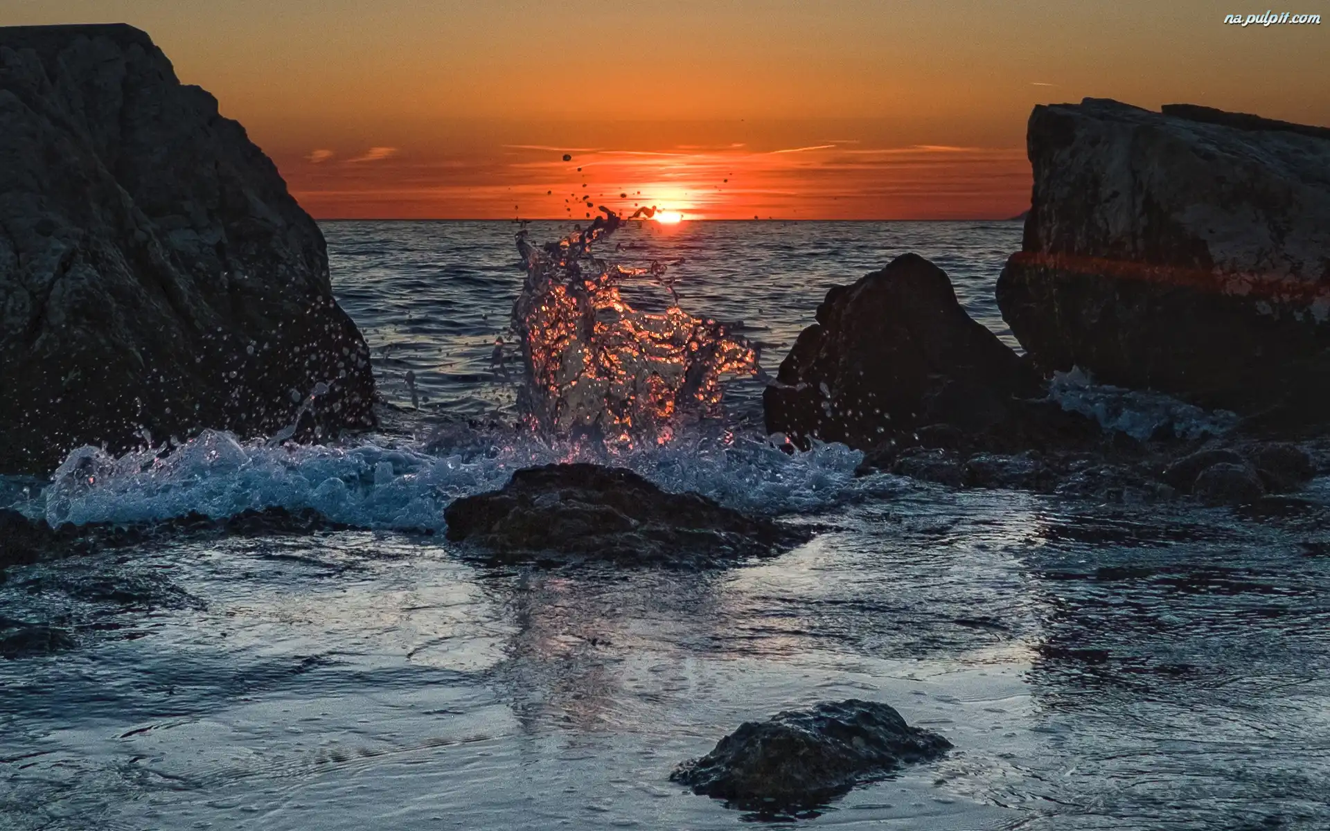 Kamienie, Skały, Morze, Zachód słońca Na Pulpit