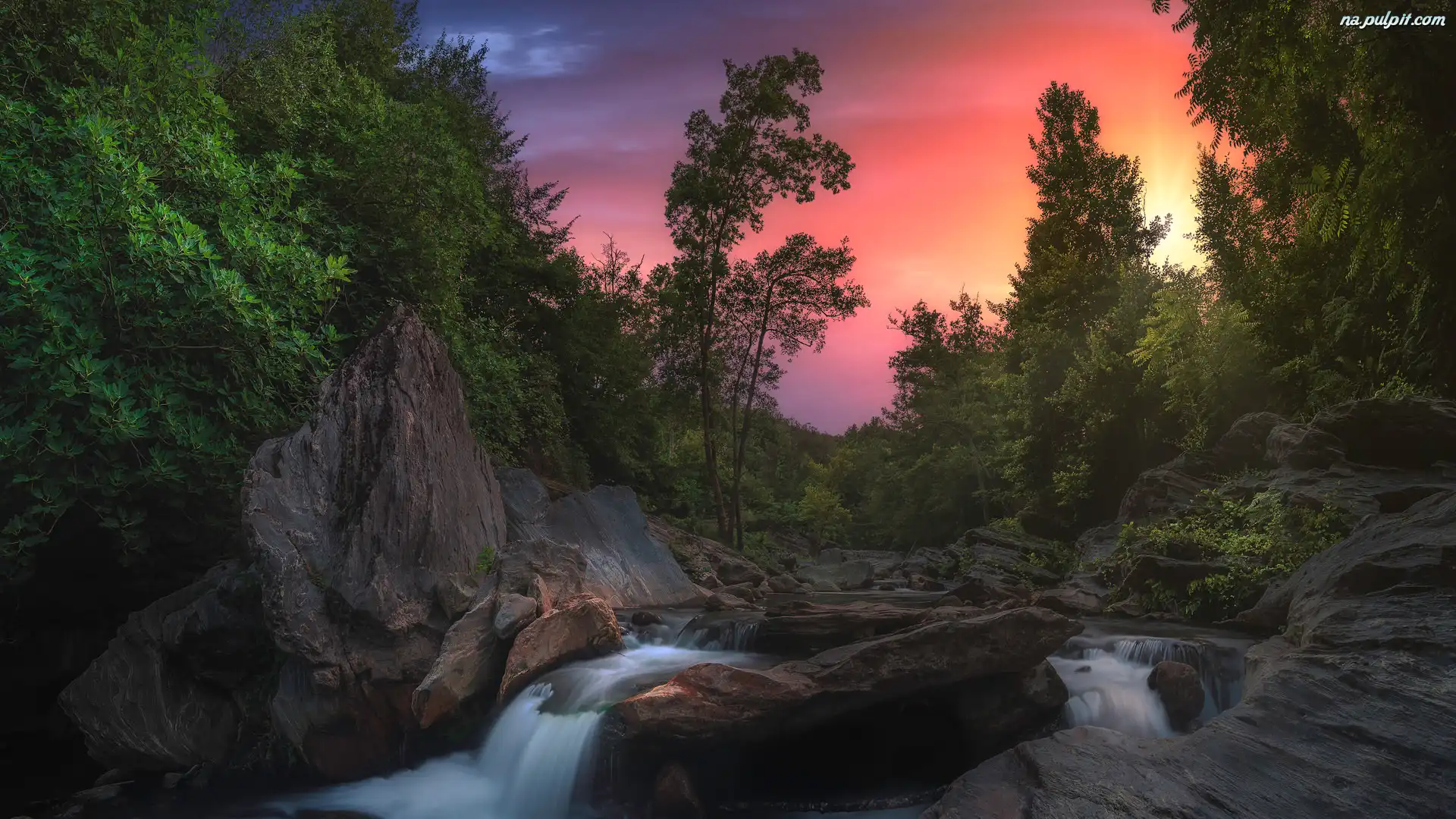 Kamienie, Las, Skały, Rzeka, Zachód słońca Na Pulpit