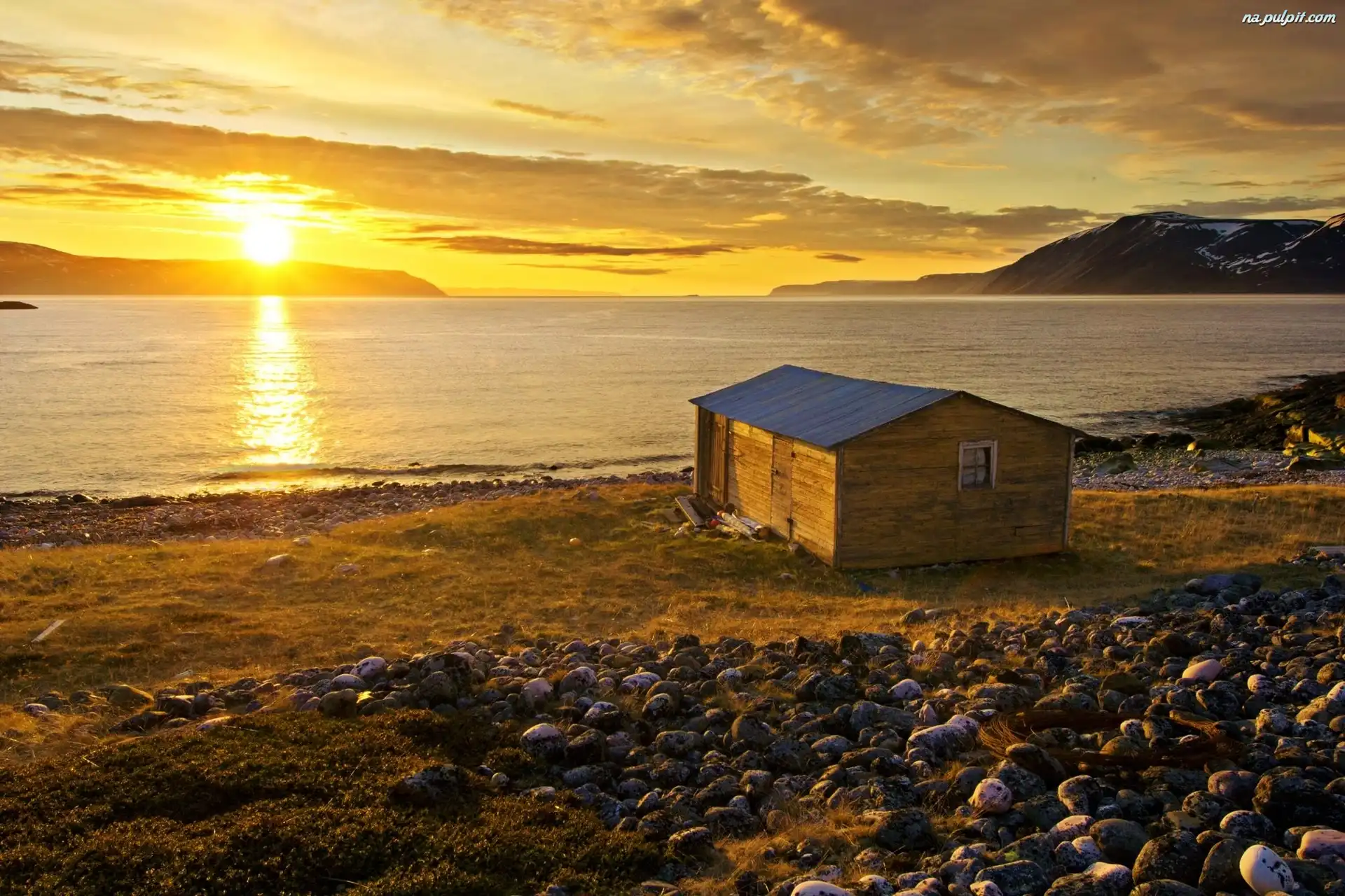 Kamienie, Chata, Słońca, Zachód, Jezioro Na Pulpit