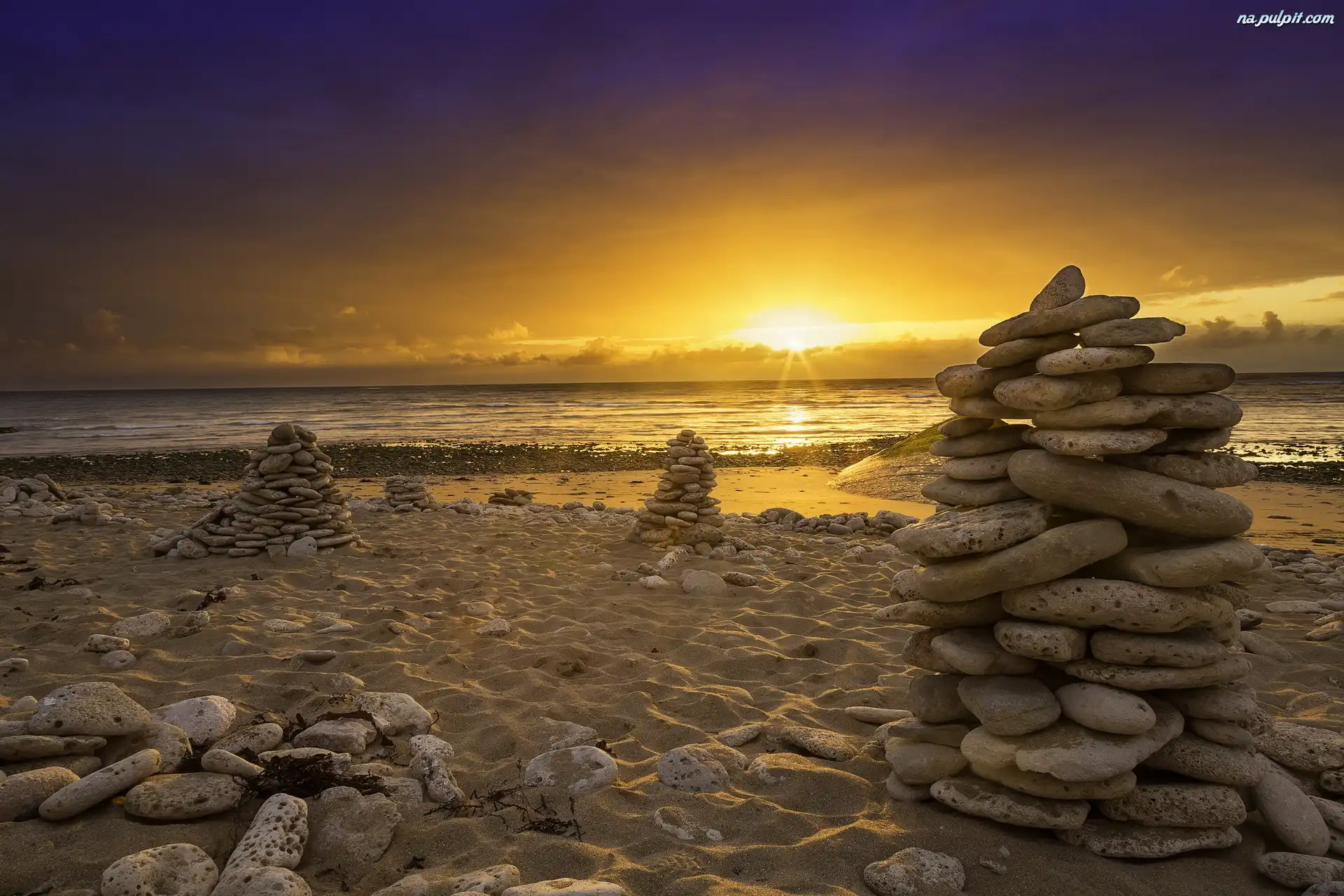 Kamienie, Morze, Słońca, Zachód, Plaża Na Pulpit