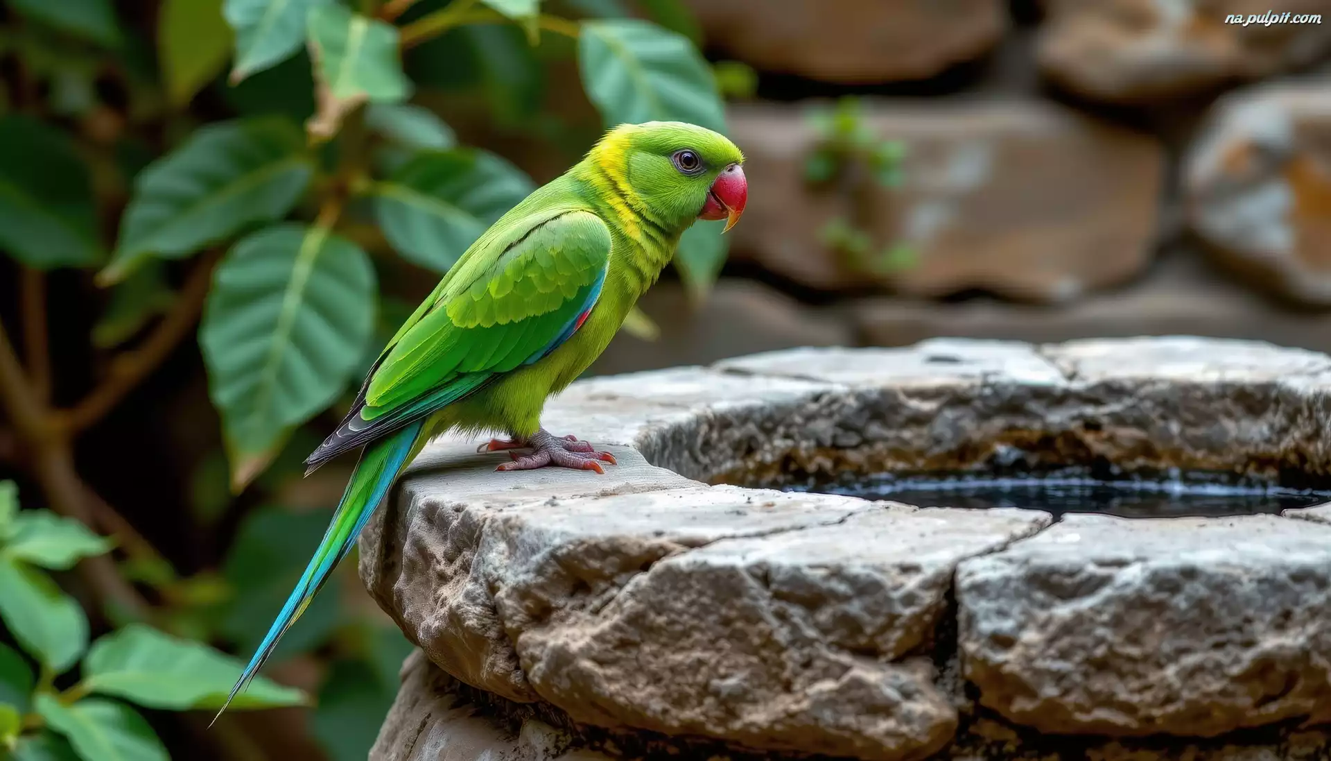 Poidło, Papuga, Ptak, Kamienne, Zielona, Grafika AI Na Pulpit