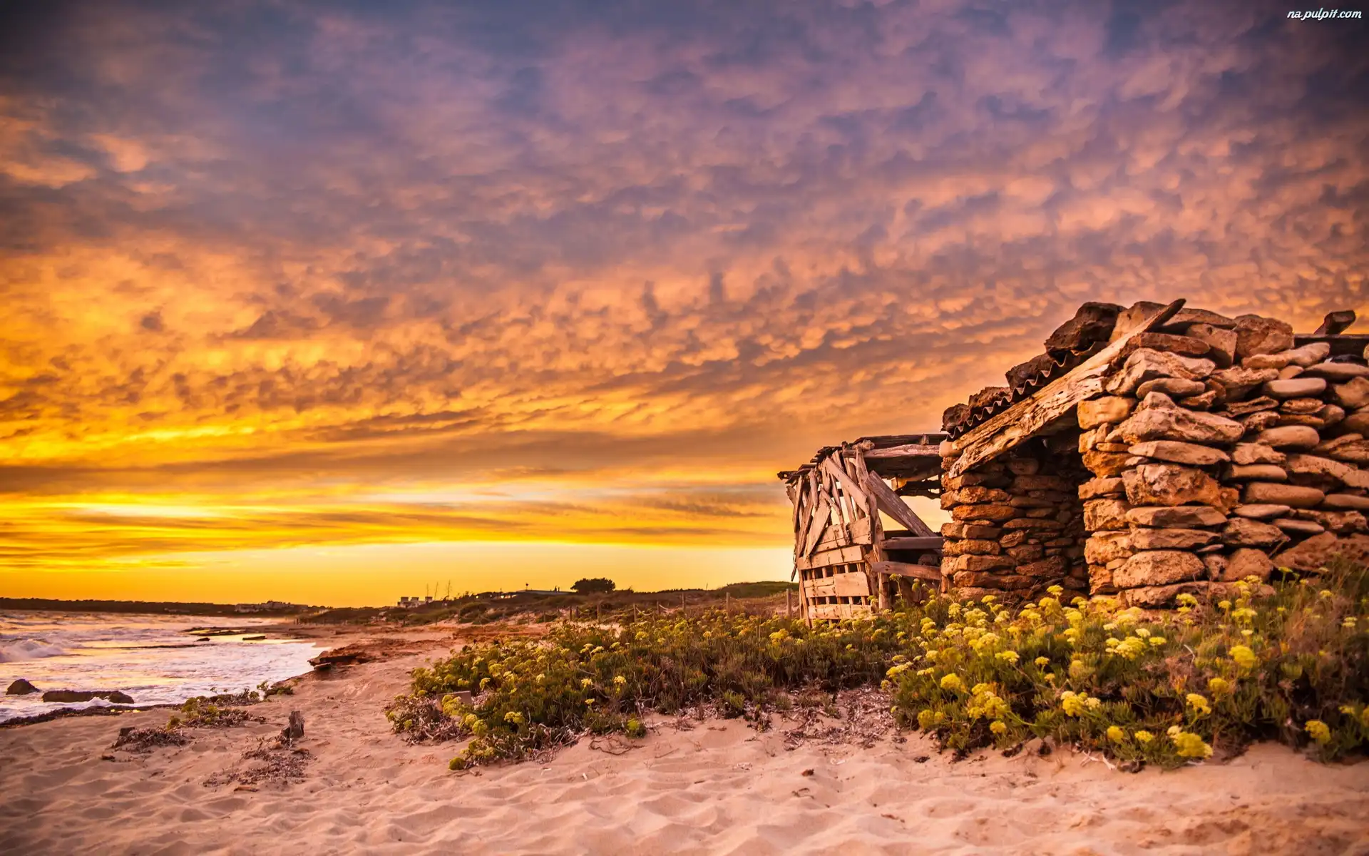 Kamienny, Plaża, Słońca, Zachód, Domek