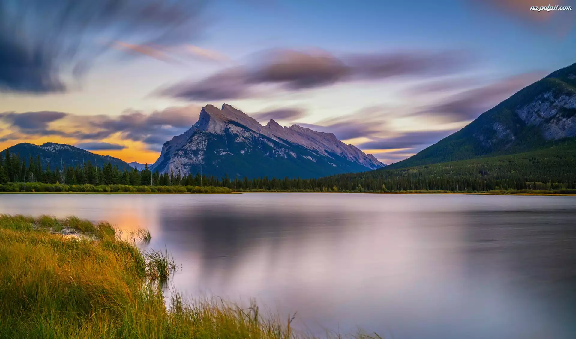 Las, Jezioro, Drzewa, Park Narodowy Banff, Kanada, Alberta, Góry, Vermilion Lakes Na Pulpit