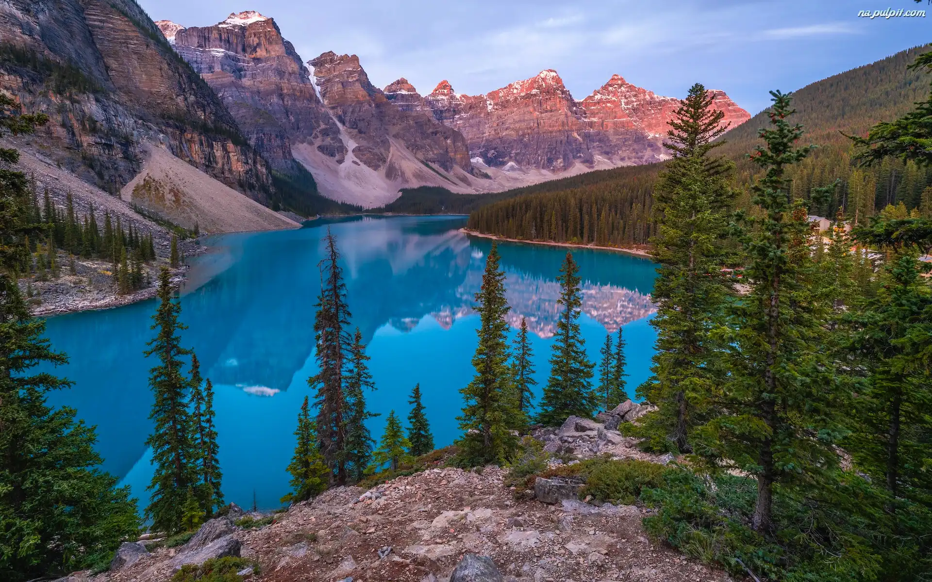 Jezioro, Park Narodowy Banff, Moraine Lake, Kanada, Skała, Drzewa, Alberta, Góry Na Pulpit