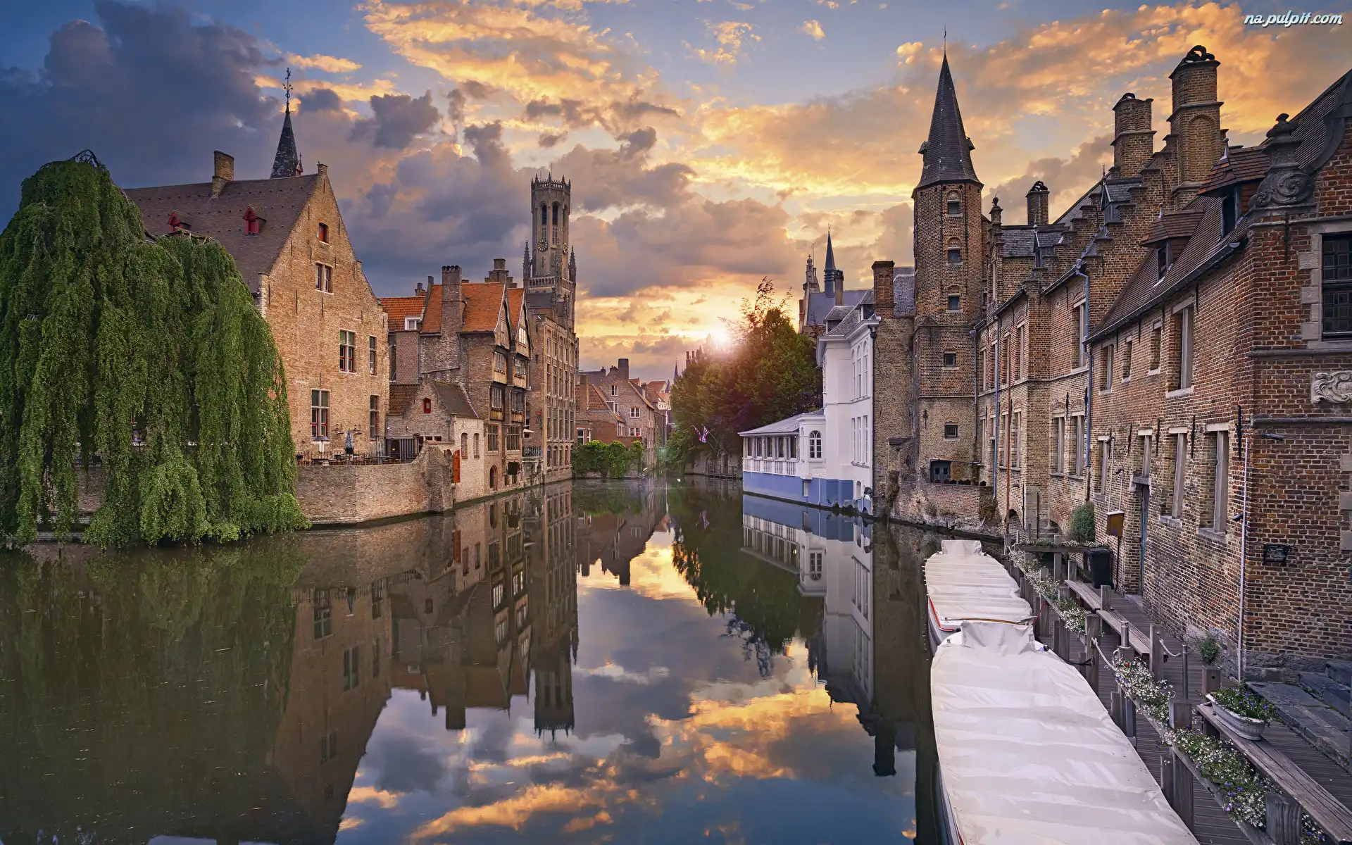 Zachód słońca, Kanał wodny, Łodzie, Drzewa, Brugia, Belgia, Odbicie, Domy, Chmury Na Pulpit
