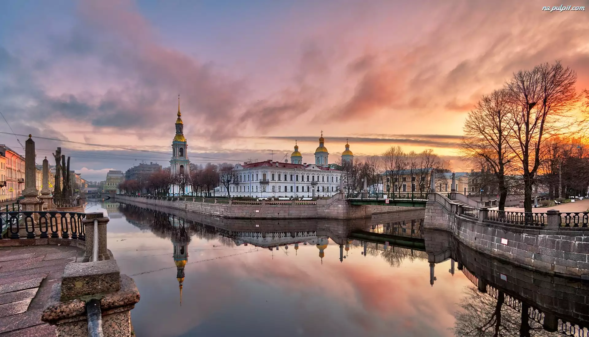 Kanał Kryukowski, Sankt Petersburg, Cerkiew, Zachód słońca, Chmury, Sobór św. Mikołaja i Objawienia Pańskiego, Rosja, Most Na Pulpit |