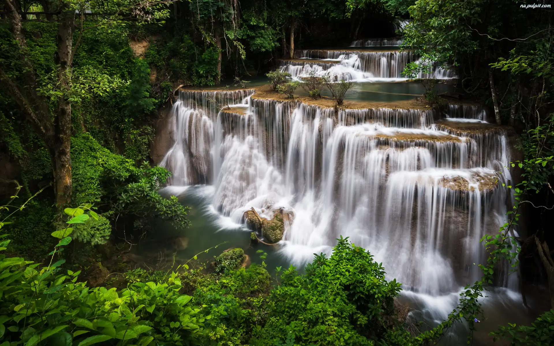 Drzewa, Prowincja Kanchanaburi, Tajlandia, Kaskada, Wodospad Erawan waterfall, Park Narodowy Erawan Na Pulpit |