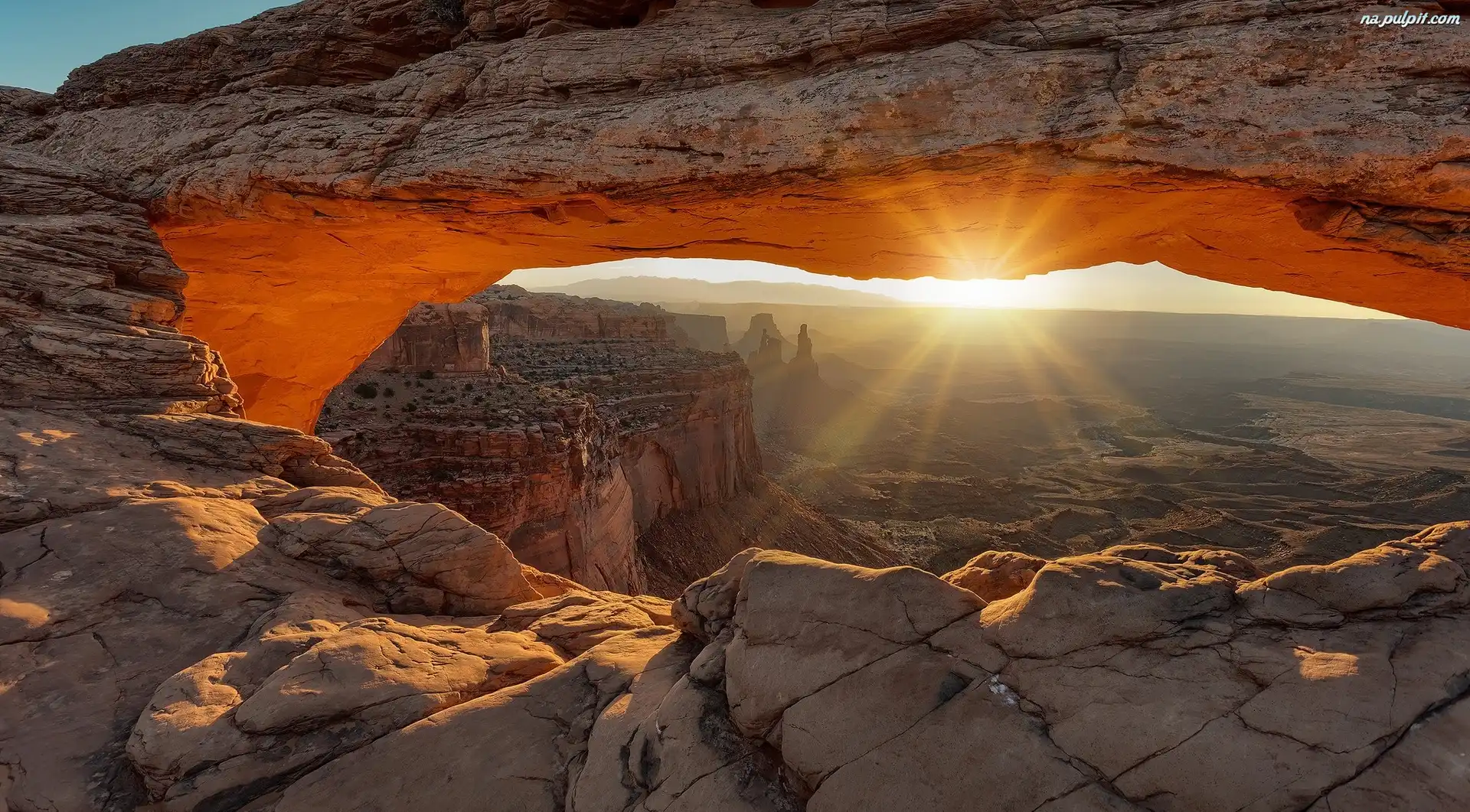 Promienie Słońca, Stan Utah, Kanion, Łuk Mesa Arch, Park Narodowy Canyonlands, Stany Zjednoczone, Skały Na Pulpit |