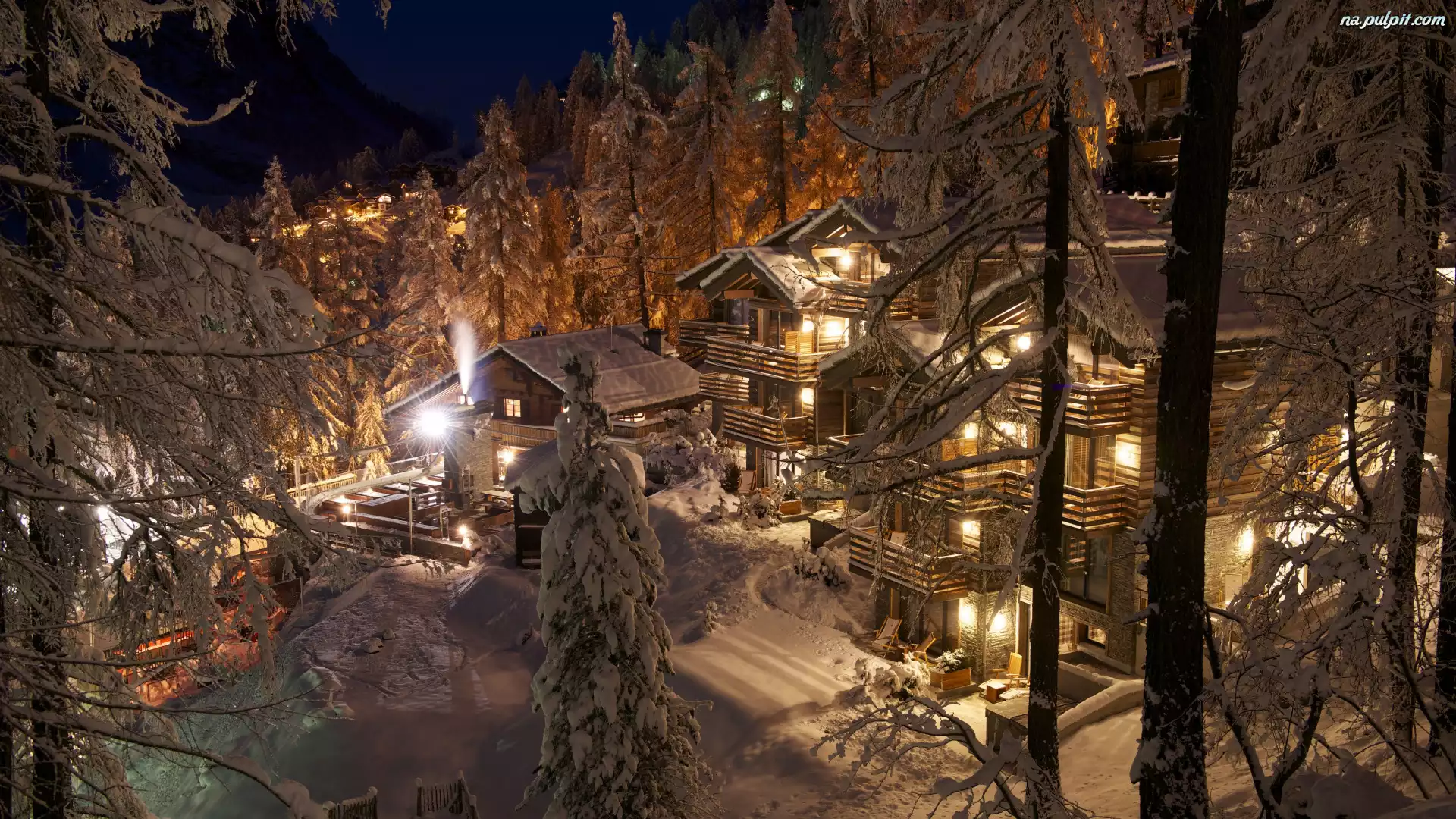 Kanton Valais, CERVO Mountain Boutique Resort, Drzewa, Zermatt, Hotel, Wieczór, Ośnieżone, Zima, Oświetlone, Szwajcaria, Domy Na Pulpit |