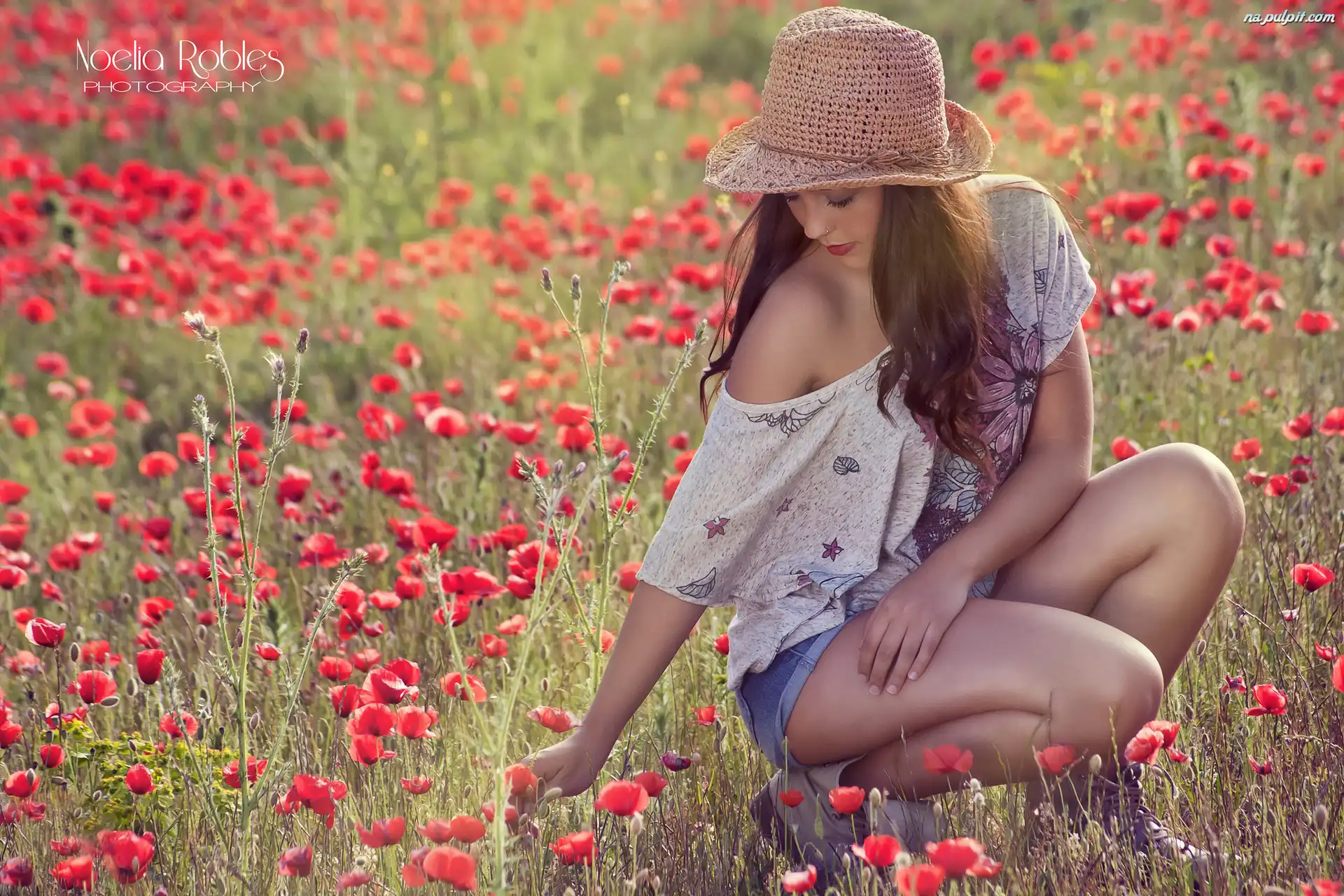 Kapelusz, Maki, Łąka, Dziewczyna Na Pulpit