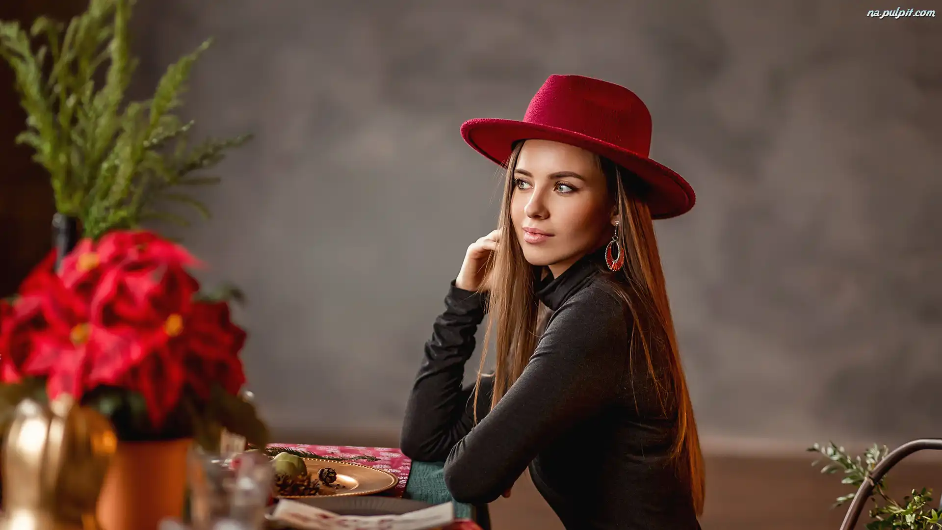 Kapelusz, Kobieta, Długowłosa, Czerwony Na Pulpit