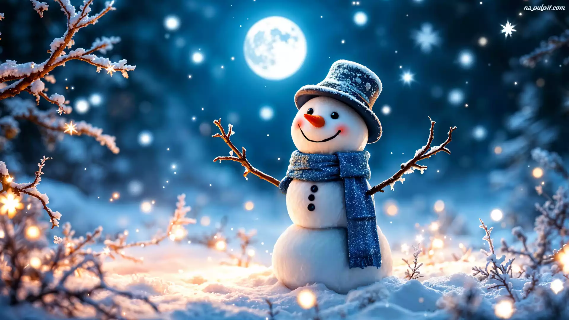 Szalik, Bałwanek, Noc, Zima, Gałązki, Księżyc, Śnieg, Kapelusz Na Pulpit