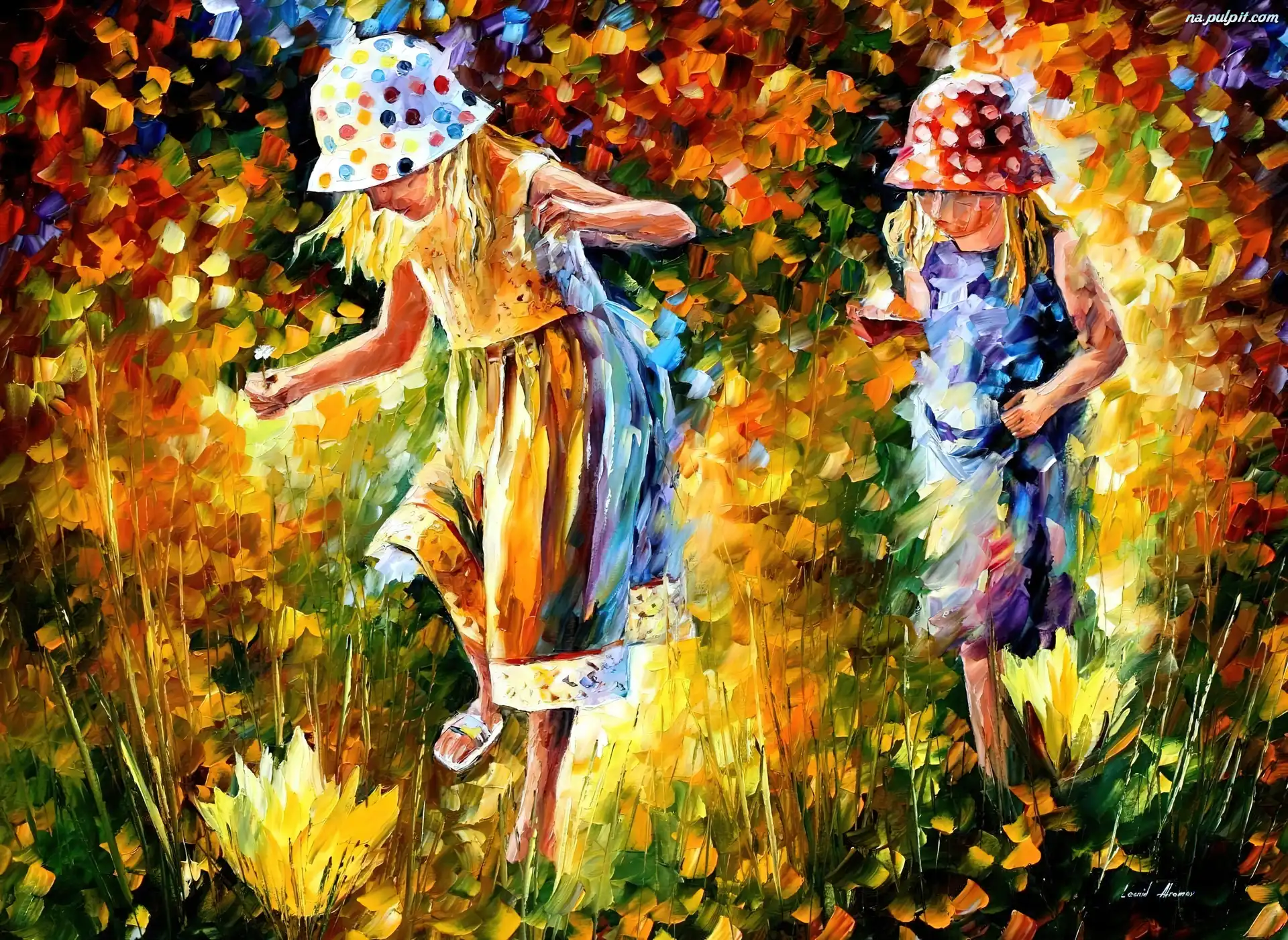 Kapelusze, Trawa, Dziewczynki, Leonid Afremov Na Pulpit