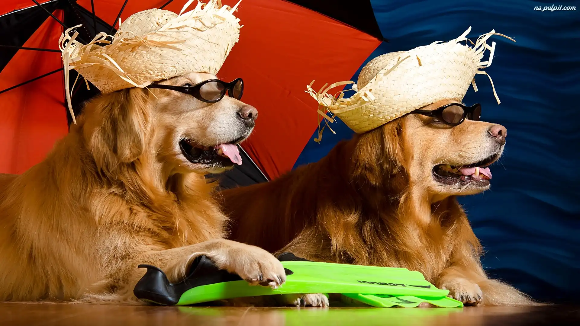 Psy, Kapelusze, Okulary, Golden retriever, Dwa, Parasol Na Pulpit