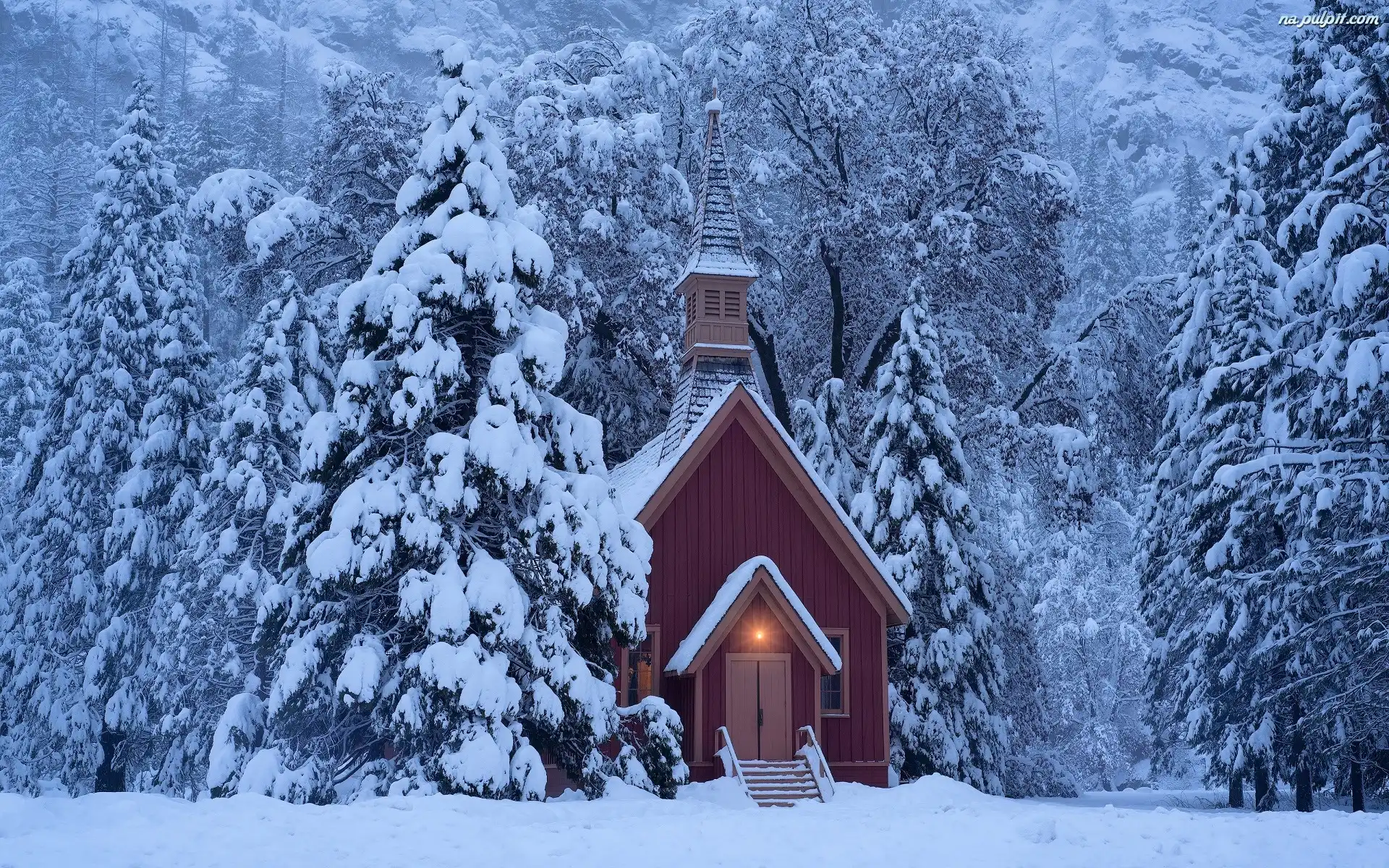 Kaplica, Stan Kalifornia, Park Narodowy Yosemite, Zima, Kościółek, Las, Ośnieżone, Stany Zjednoczone, Drzewa Na Pulpit |