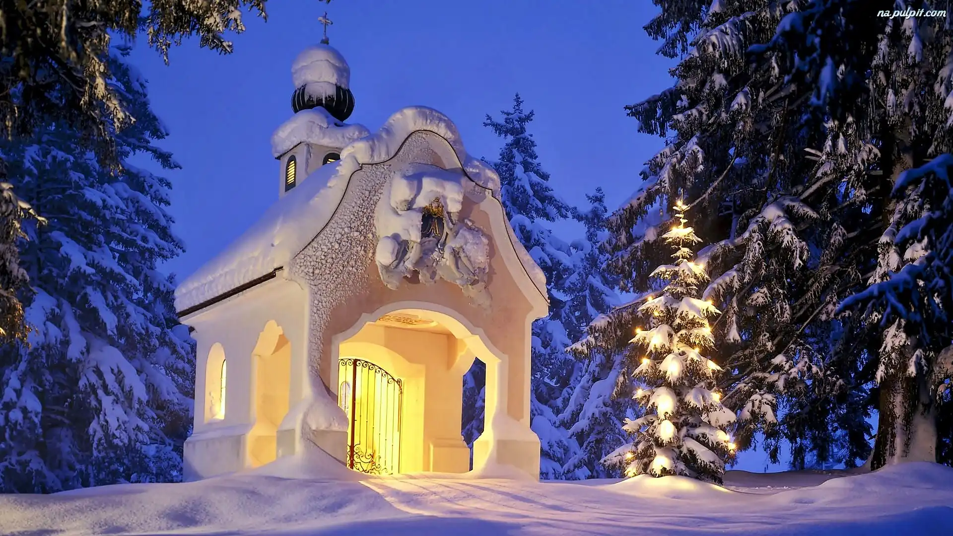 Kapliczka, Las, Zima, Podświetlona Na Pulpit