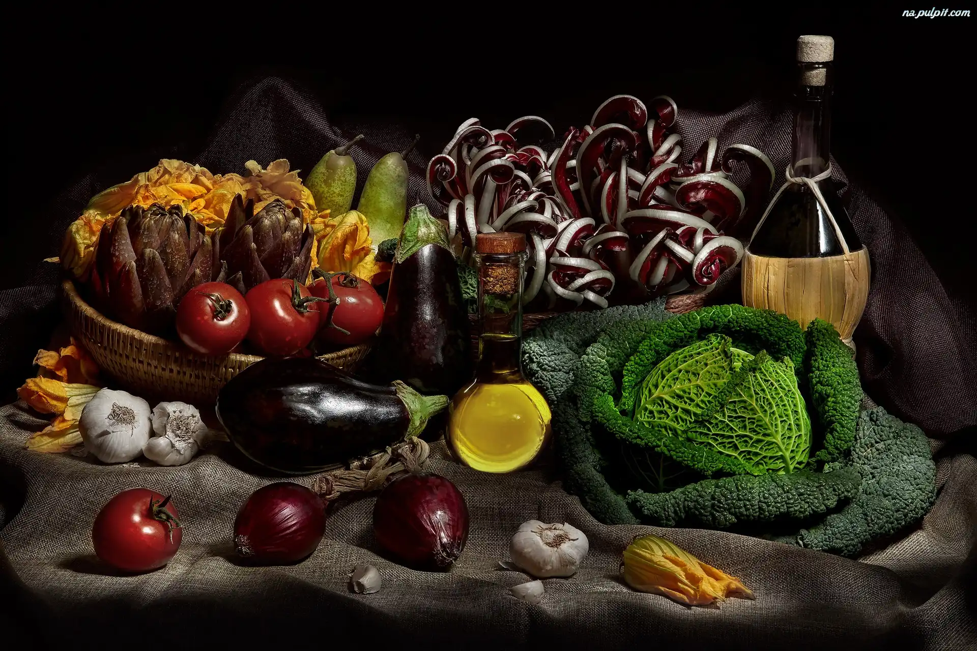 Czosnek, Pomidory, Cebula, Bakłażan, Butelka, Wino, Karczochy, Warzywa, Kapusta
