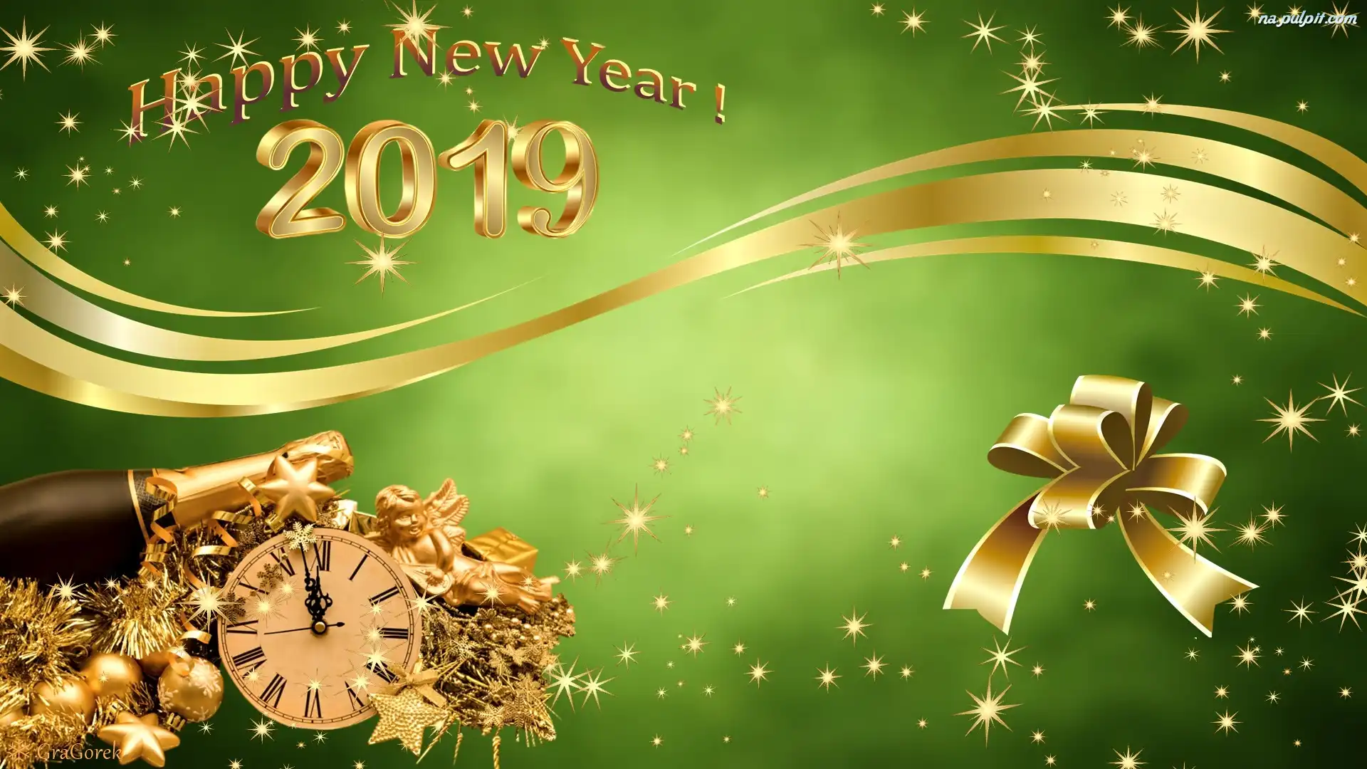 2019, Kartka, Grafika, Szampan, Nowy Rok, Zegar Na Pulpit