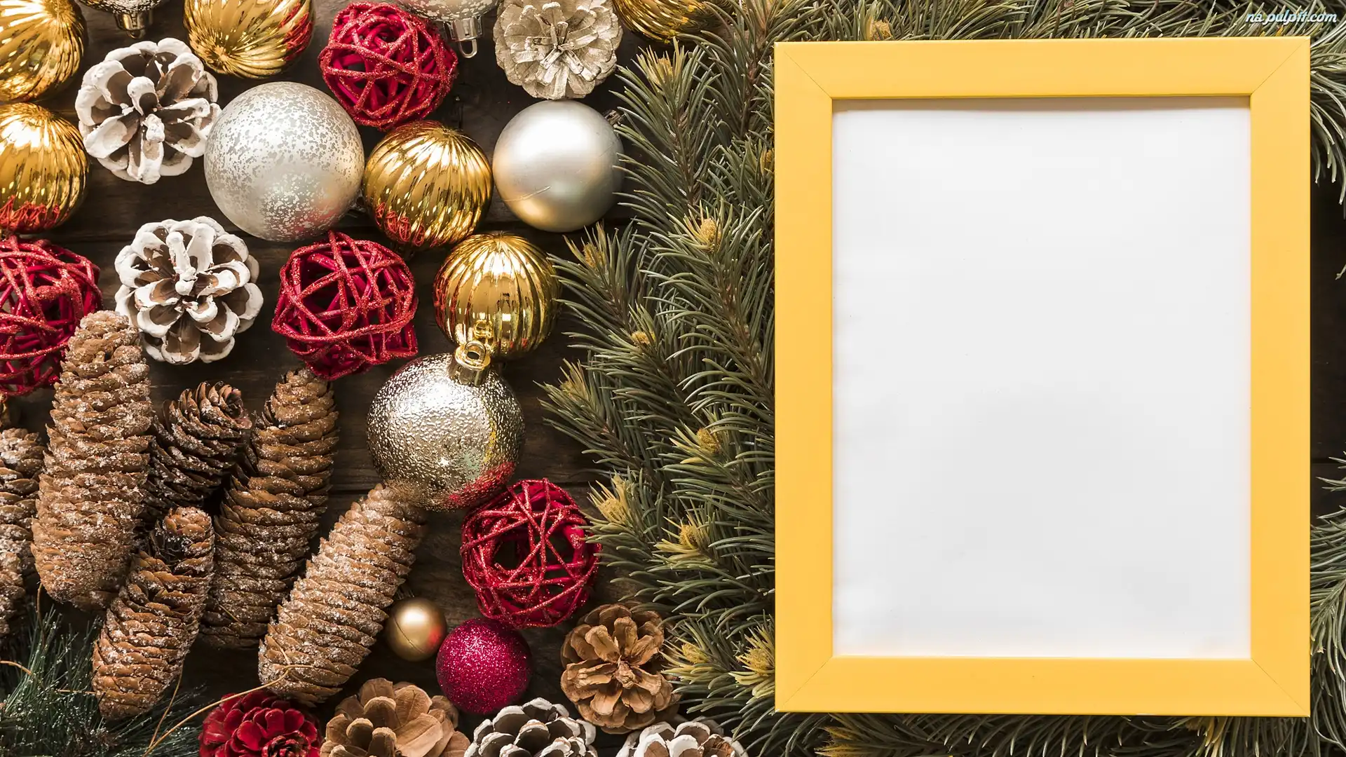 Szyszki, Kartka, Ramka, Bombki, Boże Narodzenie, Gałązki