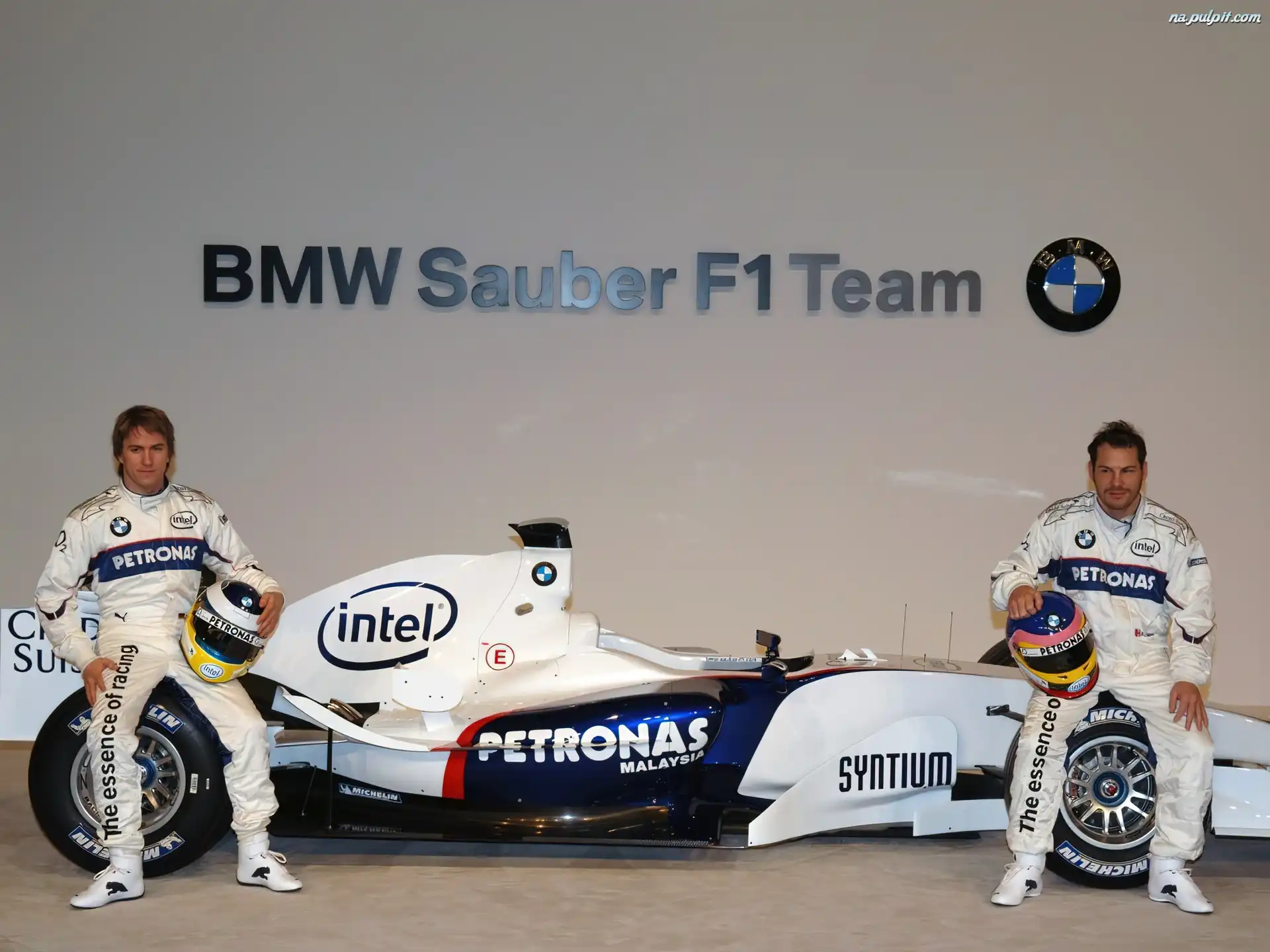spojler, BMW Sauber, koła, opony, bolid, Formuła 1, kask Na Pulpit