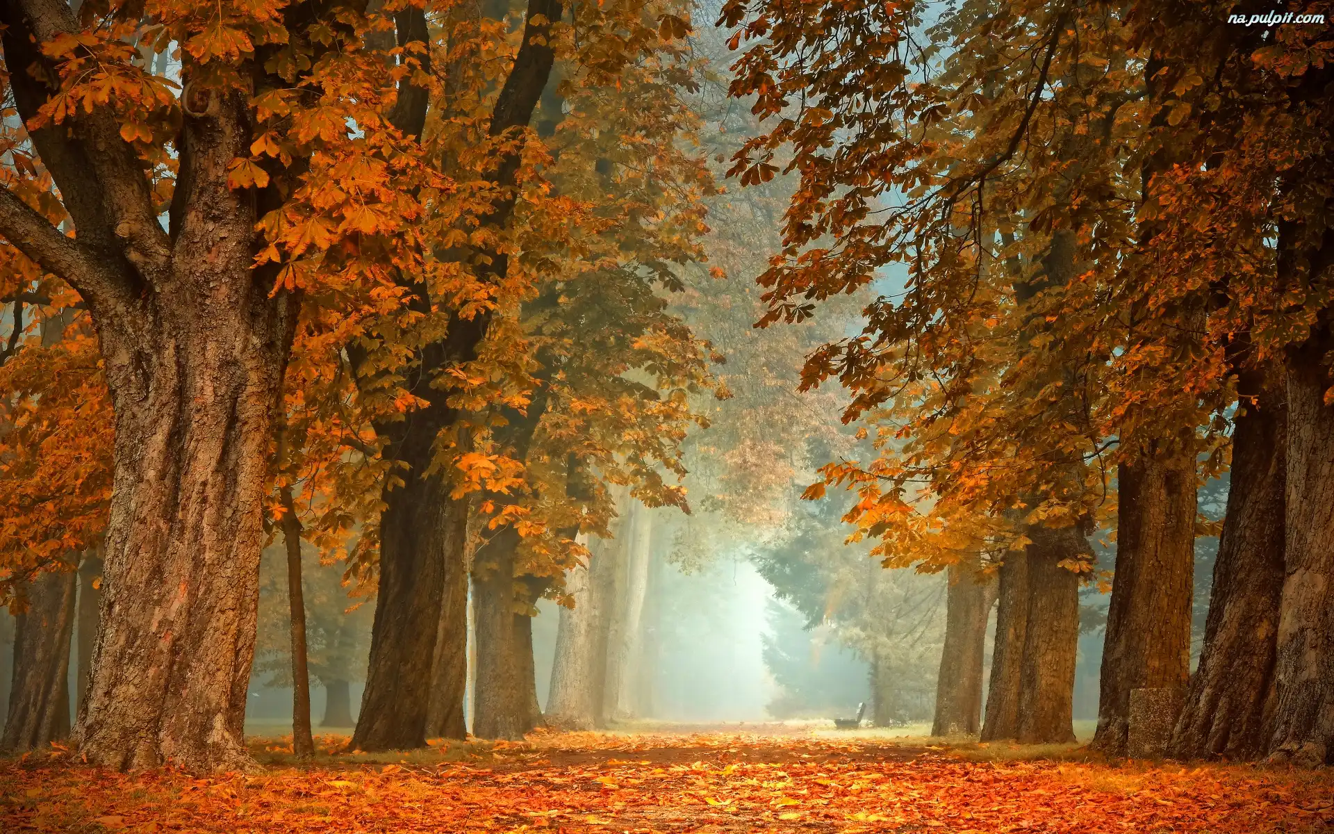 Kasztanowce, Park, Jesień, Ławka, Drzewa, Mgła Na Pulpit