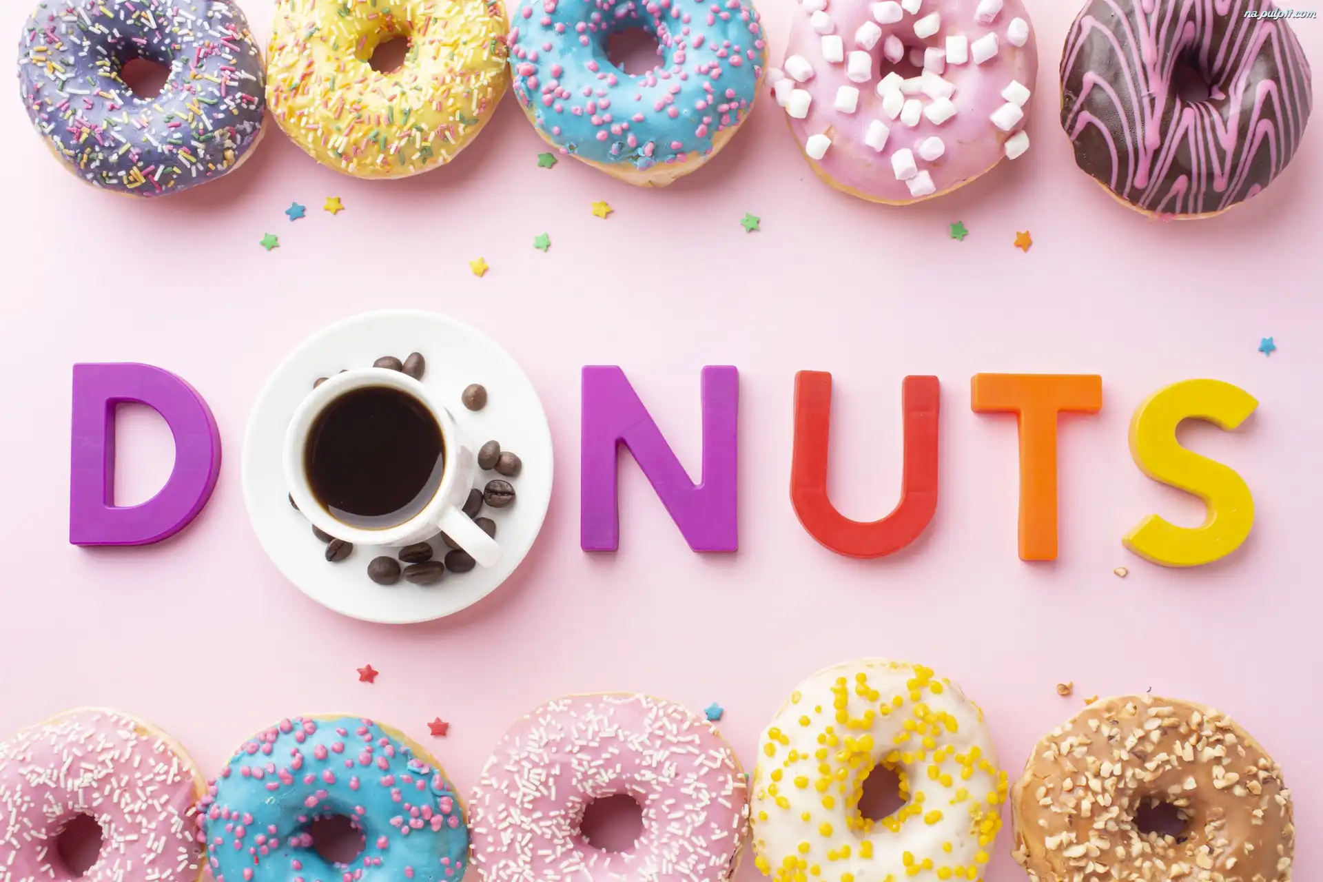 Donuty, Filiżanka, Kolorowe, Napis, Spodek, Tło, Różowe, Posypki, Pączki, Kawa Na Pulpit