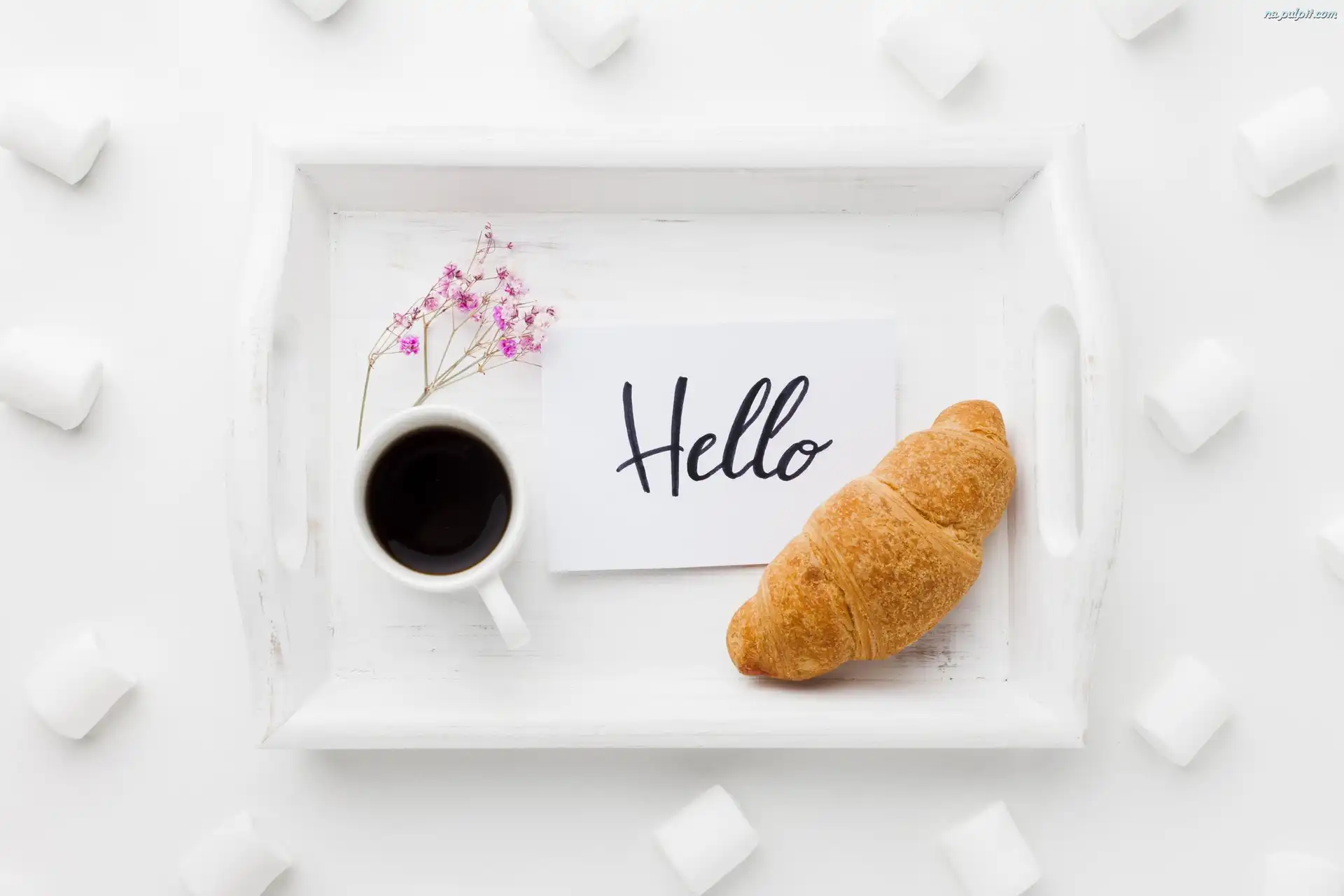 Napis, Biała, Taca, Rogalik, Hello, Pianki, Filiżanka, Śniadanie, Kawa Na Pulpit