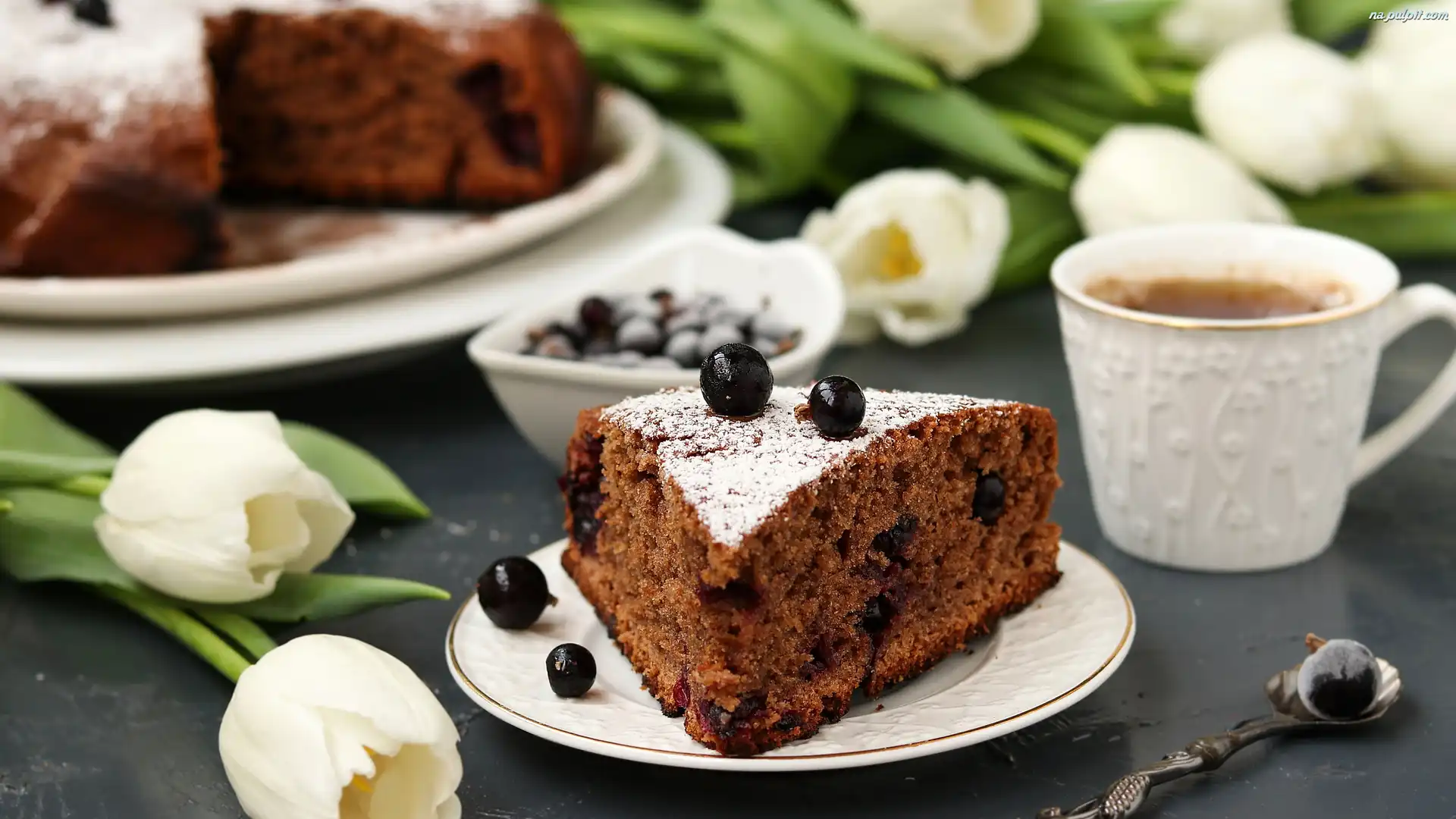 Tulipany, Kawałek, Jagody, Kawa, Kubek, Talerzyk, Ciasto, Białe Na Pulpit