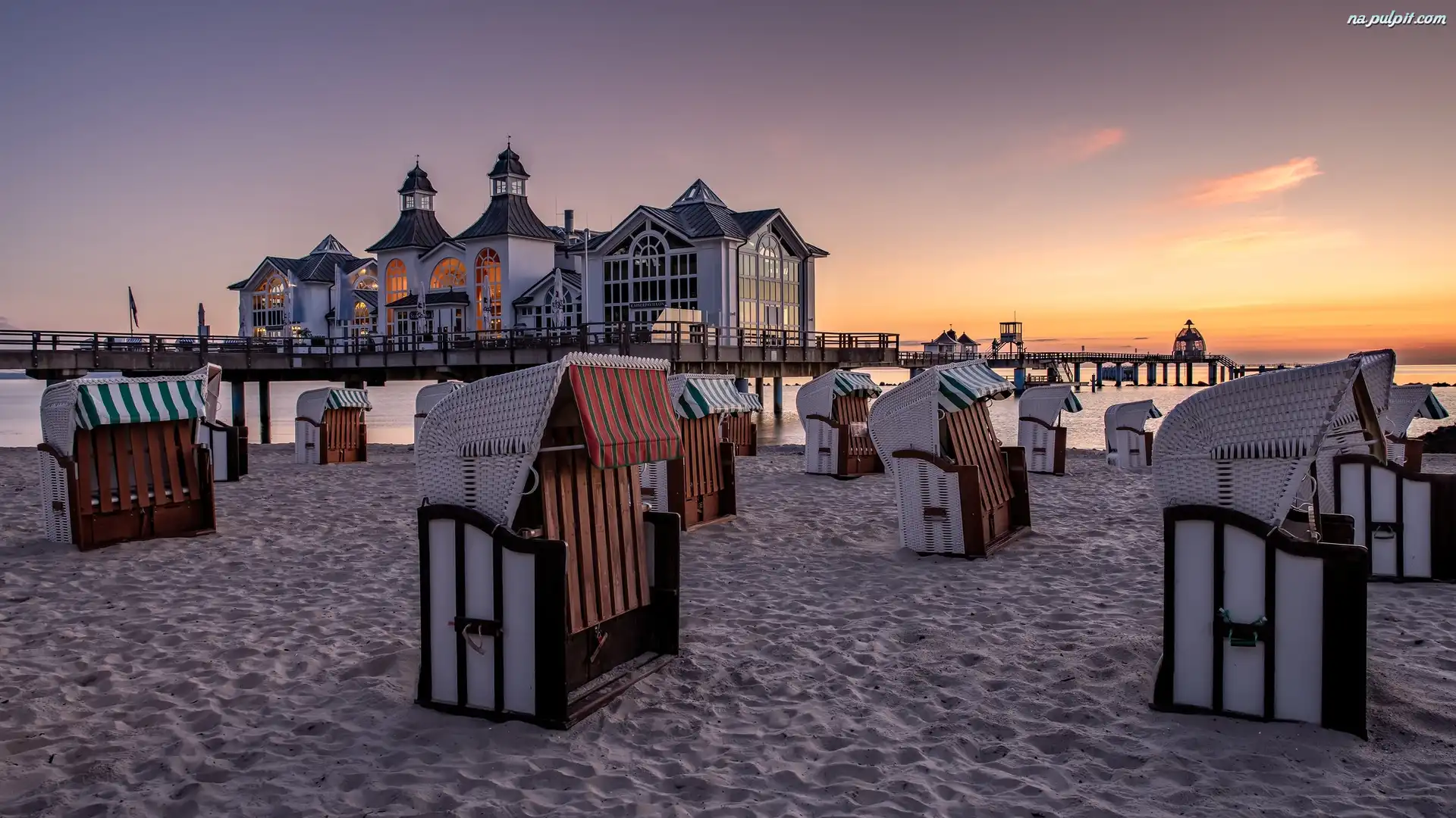 Zachód słońca, Kosze plażowe, Kawiarnia, Restauracja, Sellin, Wyspa Rugia, Niemcy, Plaża, Morze Bałtyckie, Molo Na Pulpit |