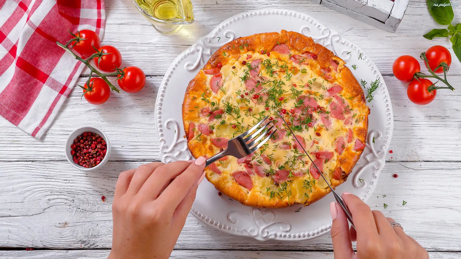 Kiełbasa, Pomidory, Deski, Talerz, Pizza, Dłonie