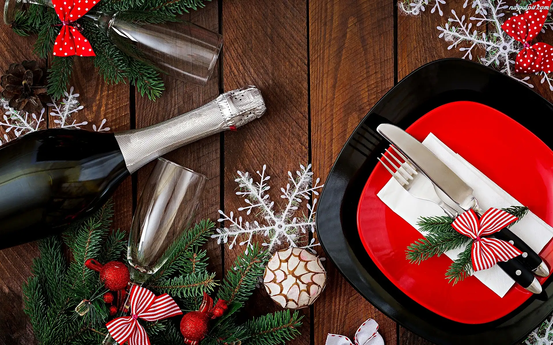 Kieliszki, Gałązki, Ozdoby, Talerze, Szampan, Sztućce