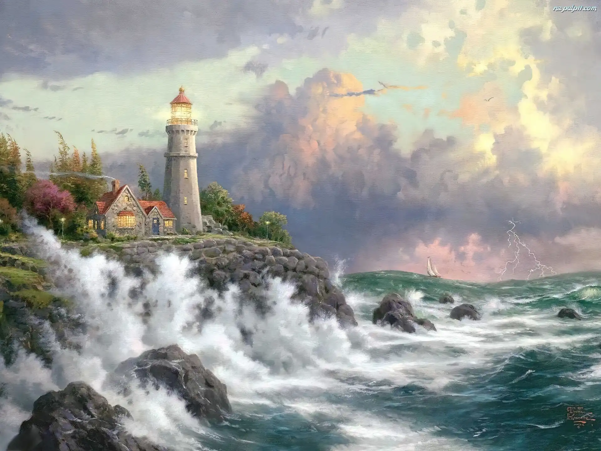 Thomas Kinkade, Niebo, Fale, Morska, Latarnia, Morze, Wybrzeże Na Pulpit