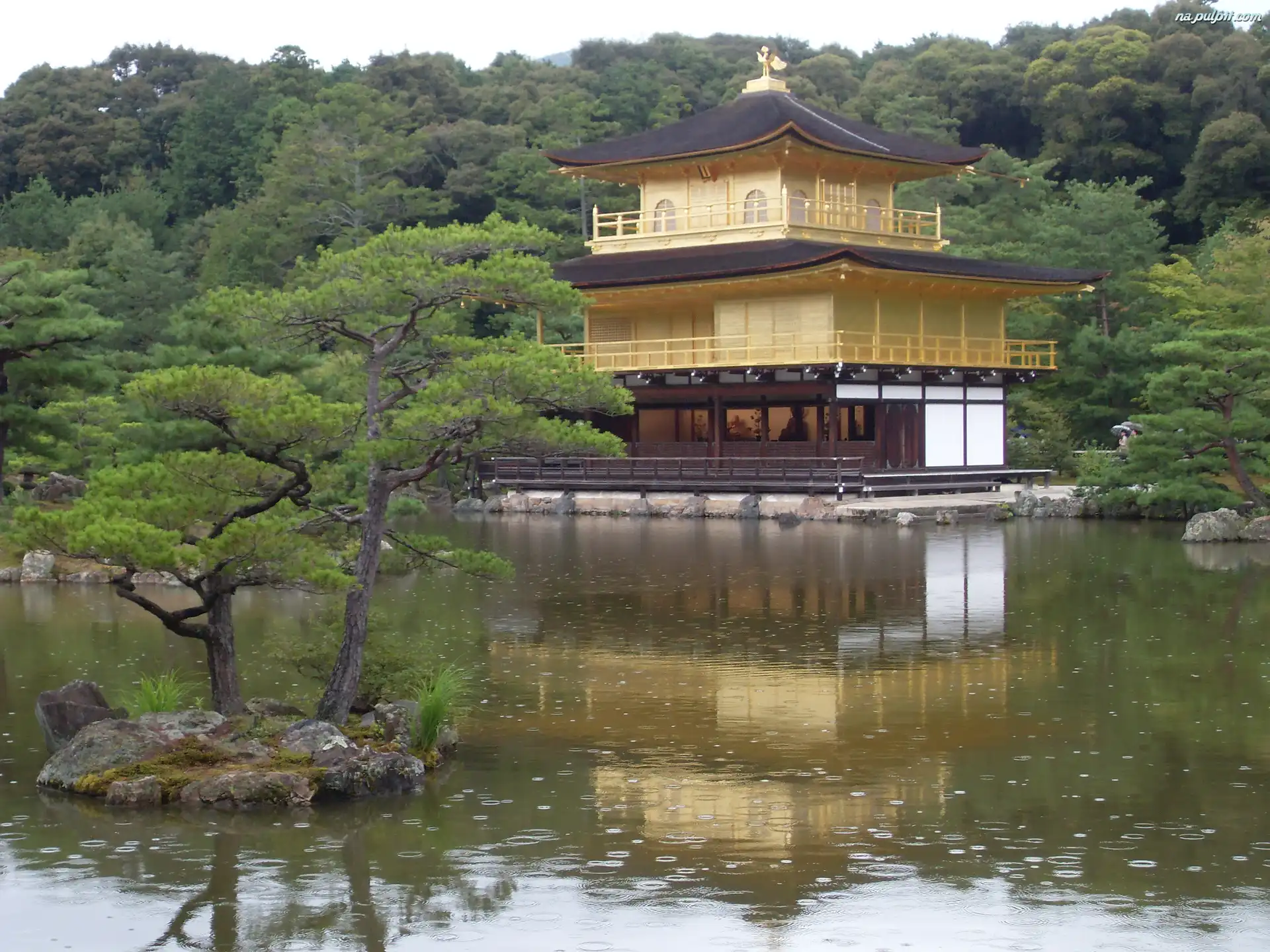 Złoty Pawilon, Kioto, Japonia, Staw Kyko chi, Świątynia Kinkakuji, Drzewa Na Pulpit