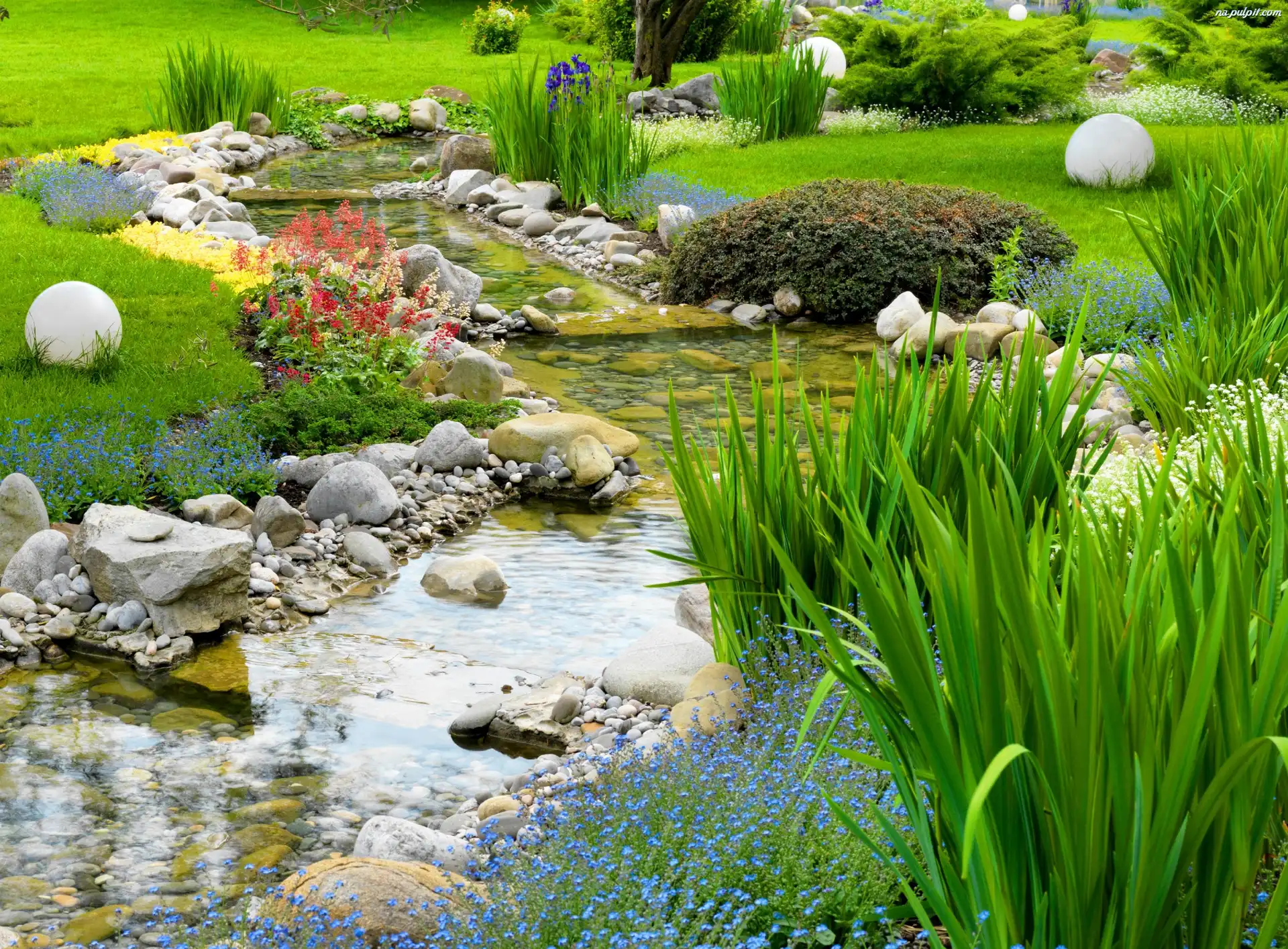 Klomby, Kamienie, Rzeczka, Ogród, Kwiaty Na Pulpit