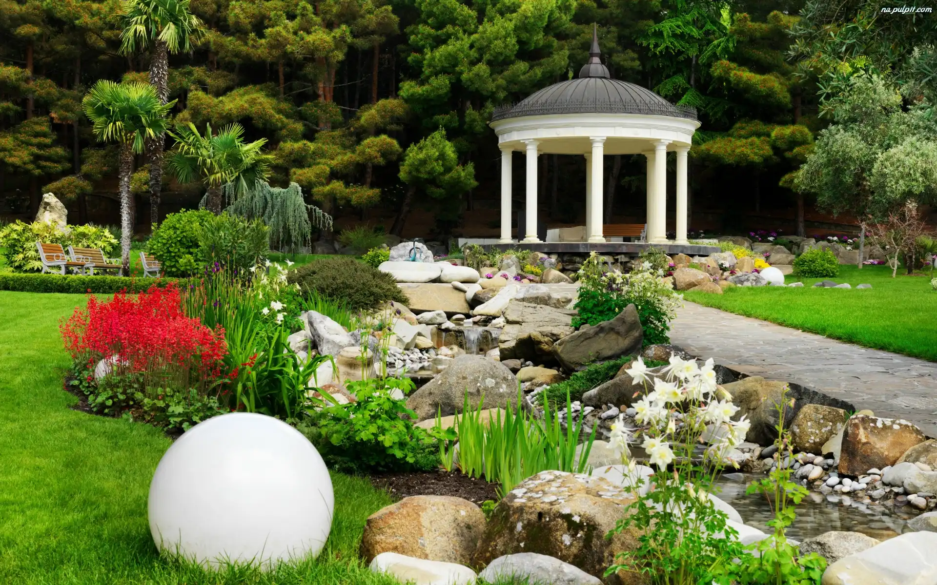 Klomby, Kwiaty, Strumyk, Park, Kamienie Na Pulpit