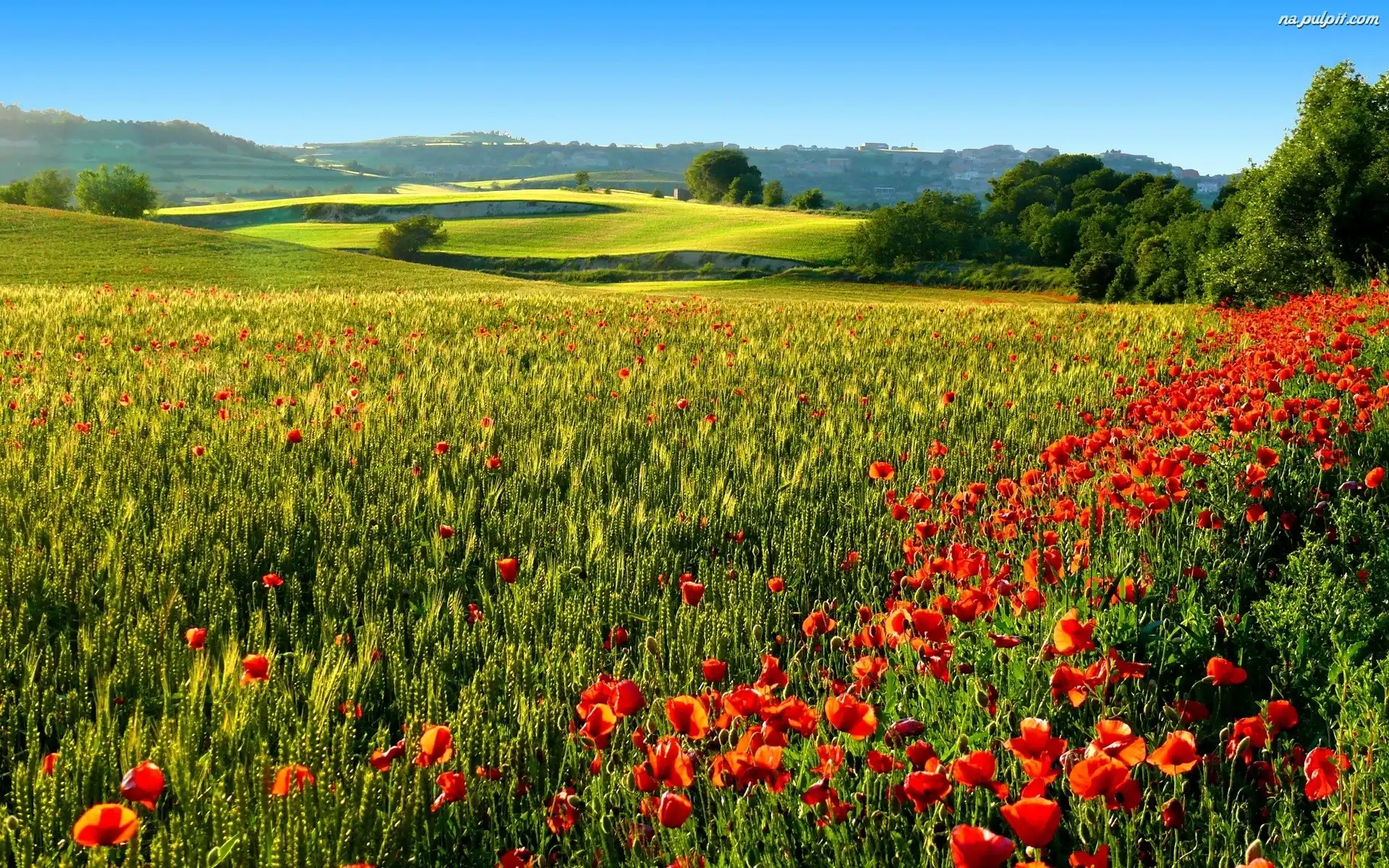 Kłosy, Wzgórza, Drzewa, Czerwone, Pole, Maki