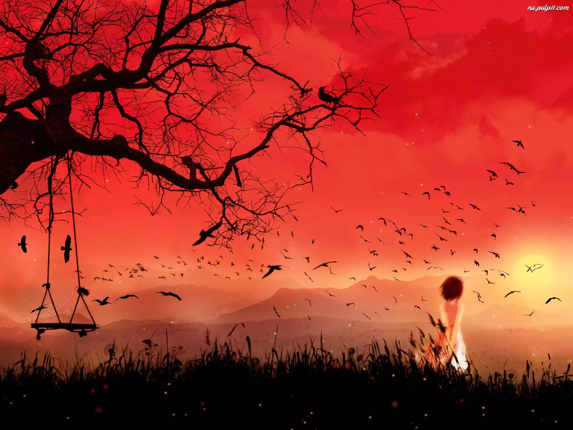 Kobieta, Drzewo, Łąka, Huśtawka Na Pulpit