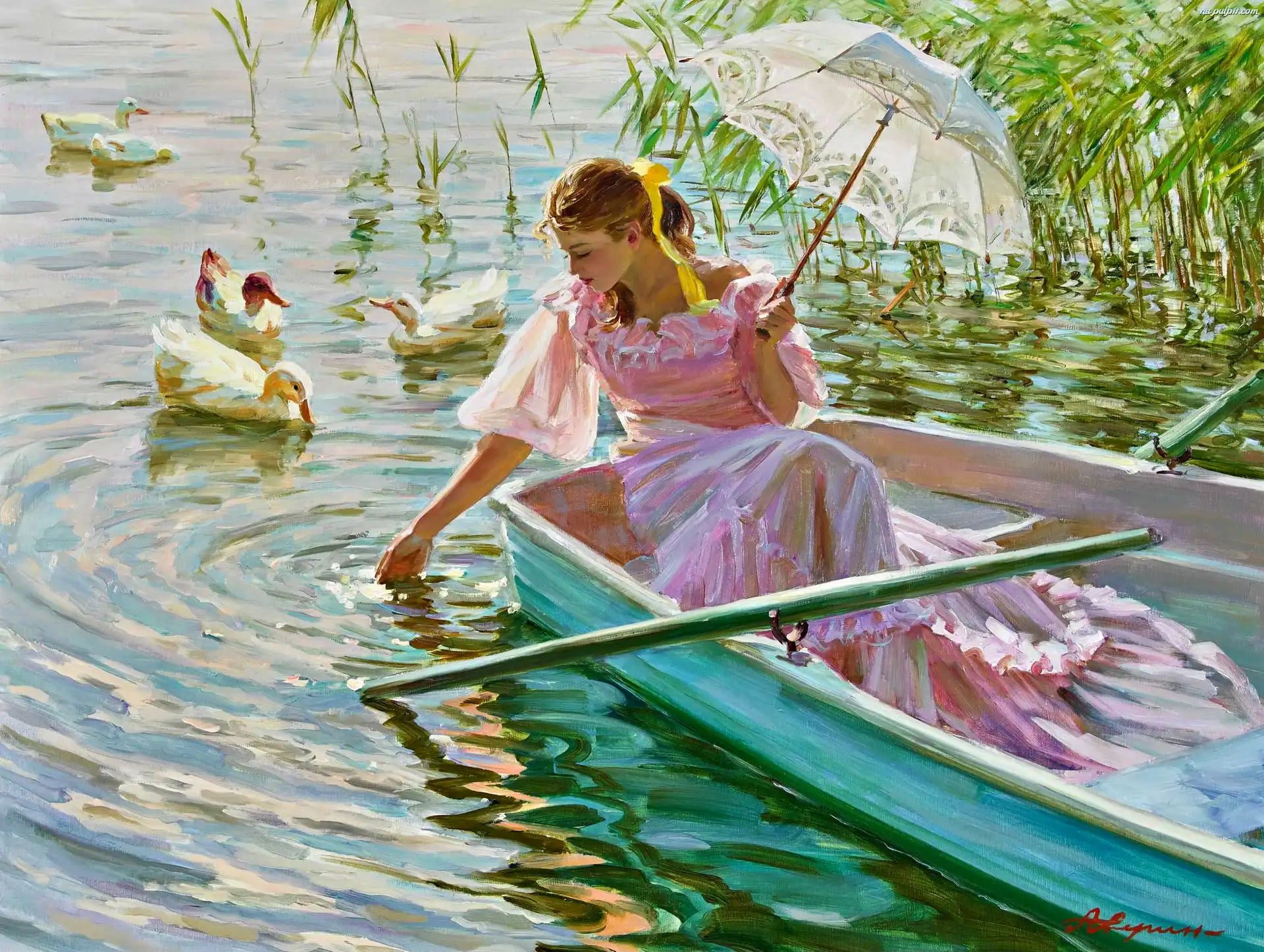 Kobieta, Lato, Malarstwo, Aleksandr Averin, Łódka