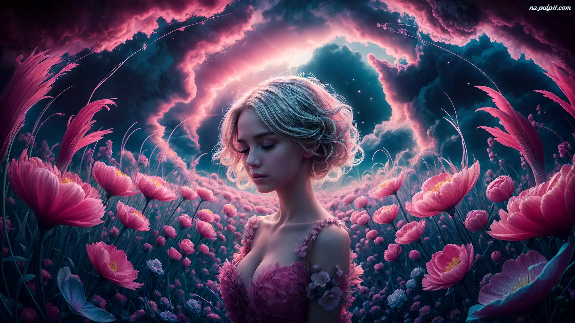 Różowe, Kobieta, Blondynka, Grafika, Kwiaty Na Pulpit