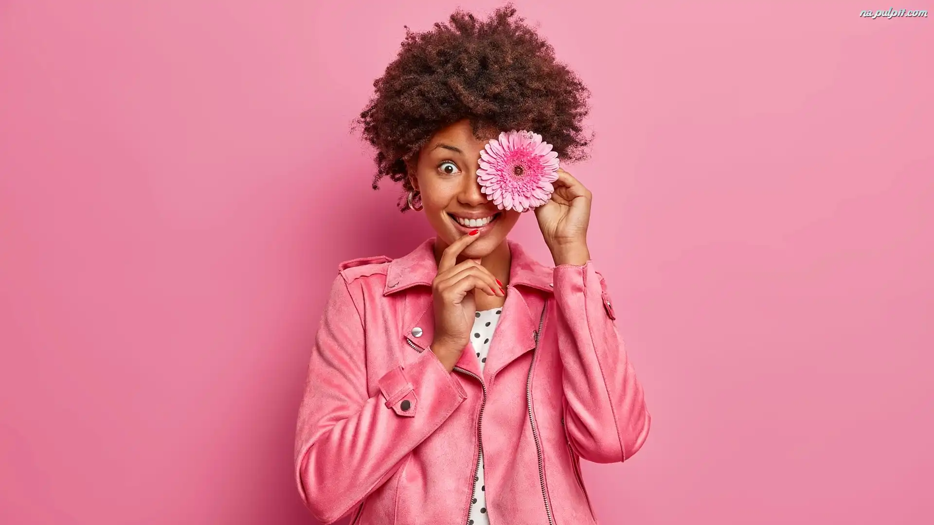 Kobieta, Różowe, Tło, Gerbera, Ciemnoskóra, Kurtka