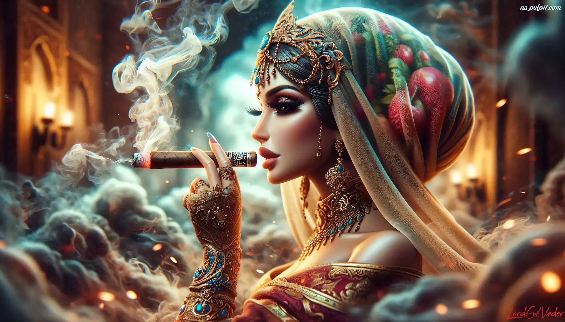 Grafika, Chusta, Cygaro, Kobieta, Makijaż, Biżuteria, Dym