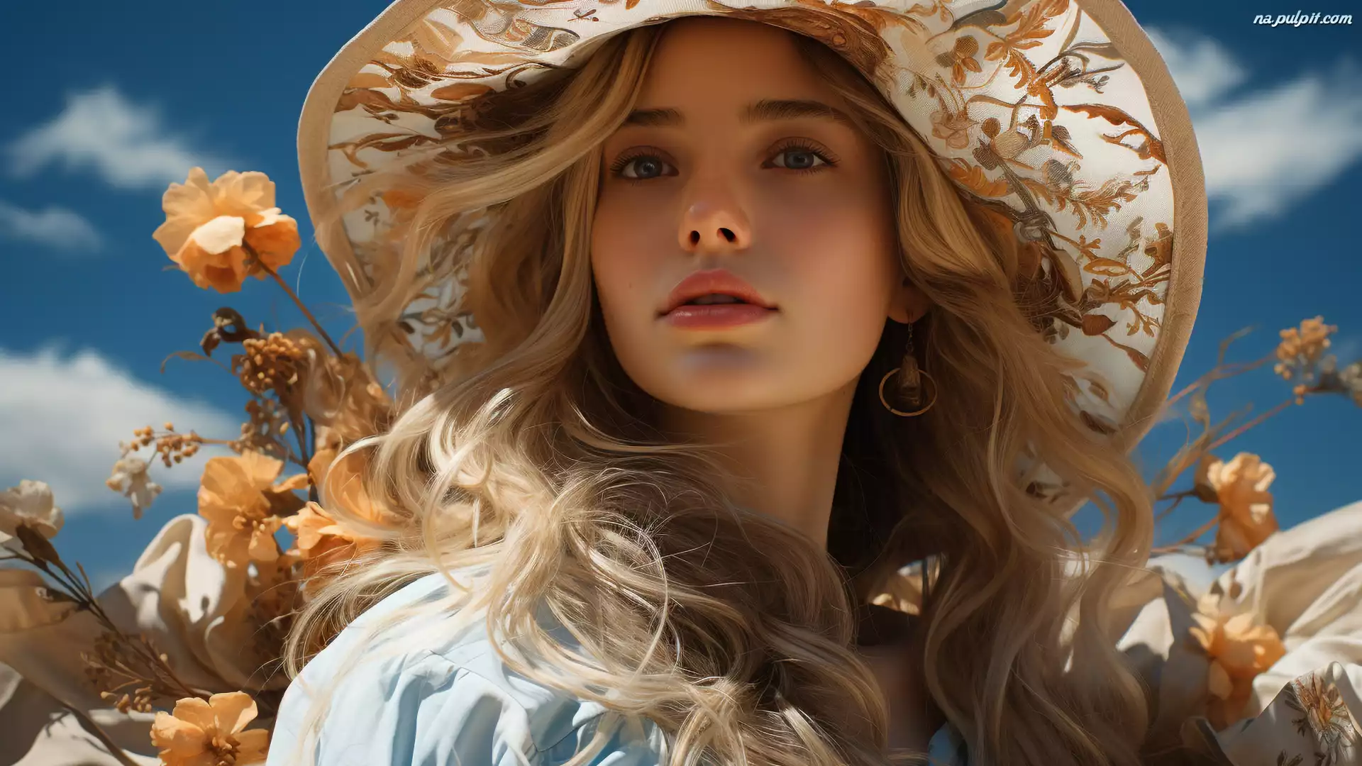Kapelusz, Kobieta, Długowłosa, Kwiaty, Blondynka
