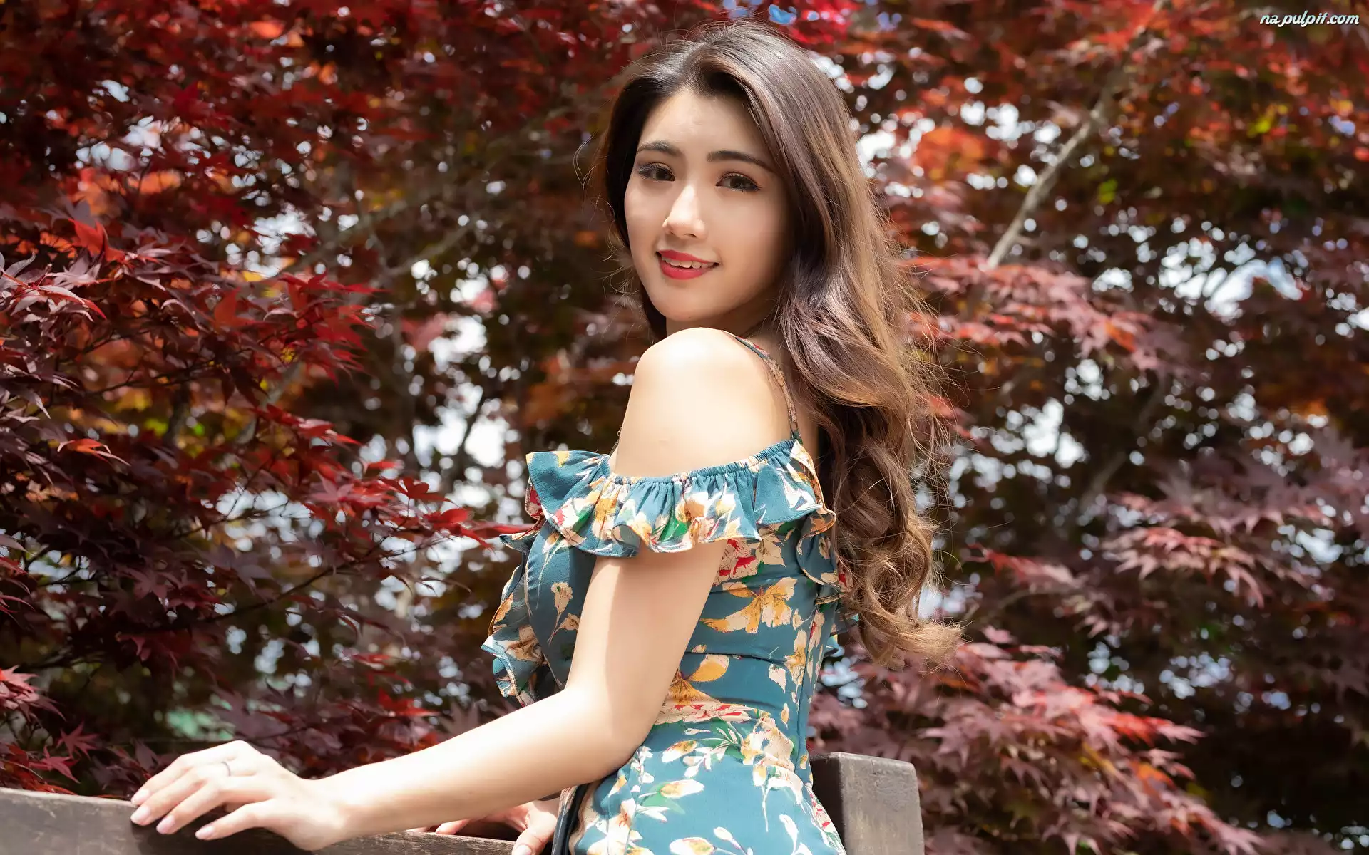 Kobieta, Kwiecista, Sukienka, Azjatka, Długowłosa, Spojrzenie
