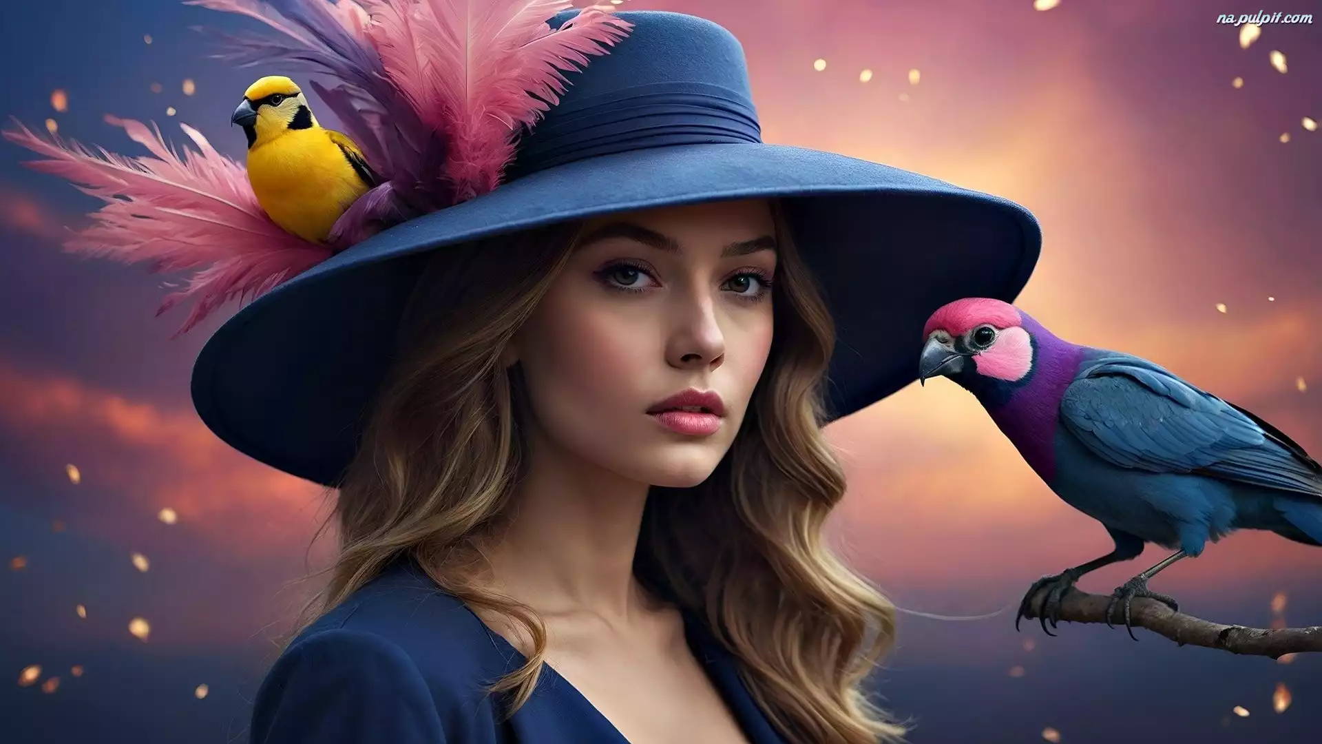 Grafika, Ptaki, Dwa, Kobieta, Kapelusz, Pióra, Papugi