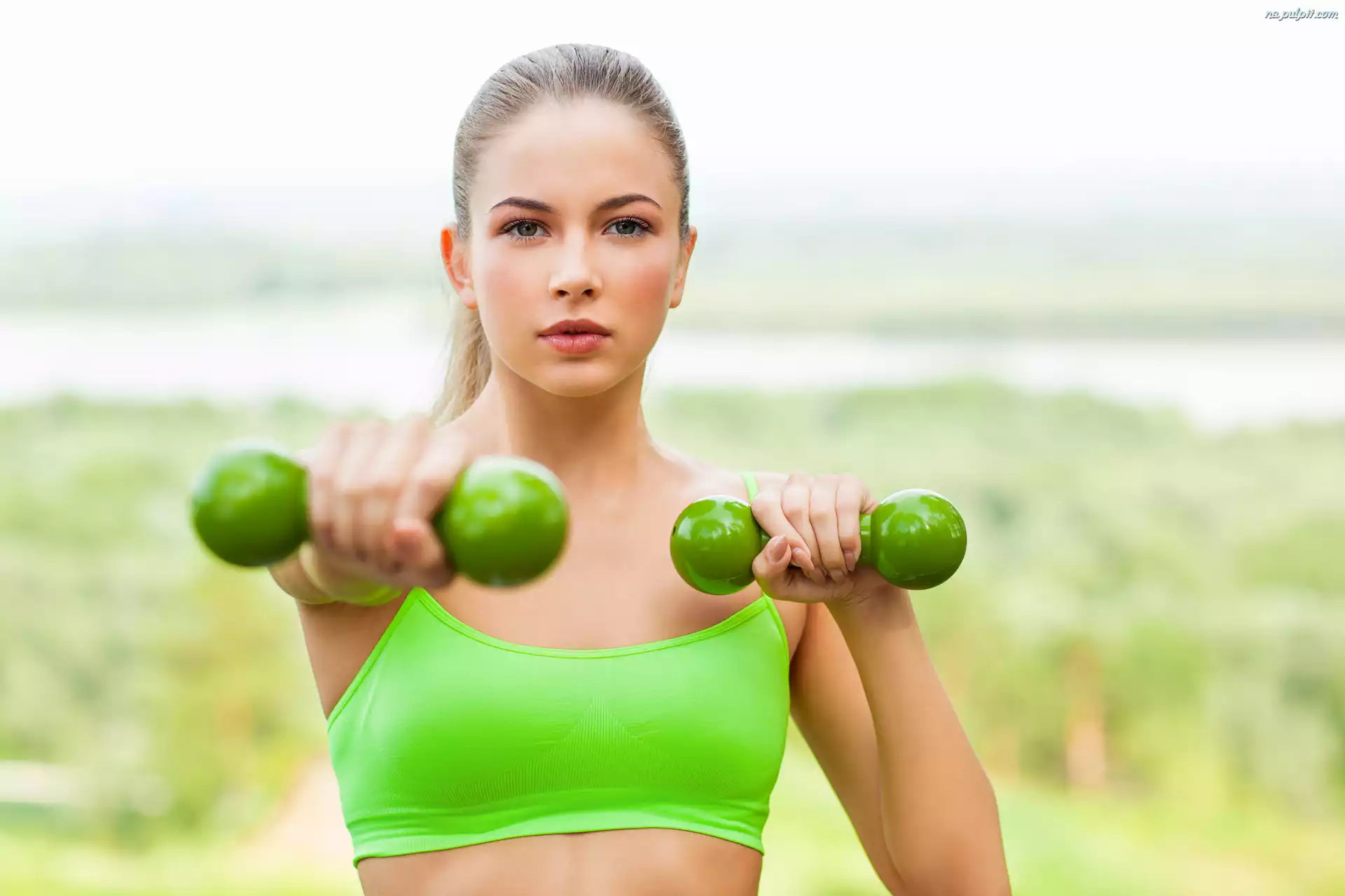 Fitness, Zielone, Ciężarki, Kobieta Na Pulpit